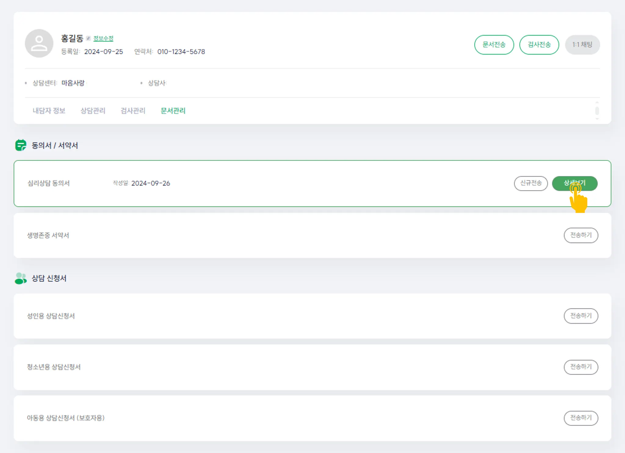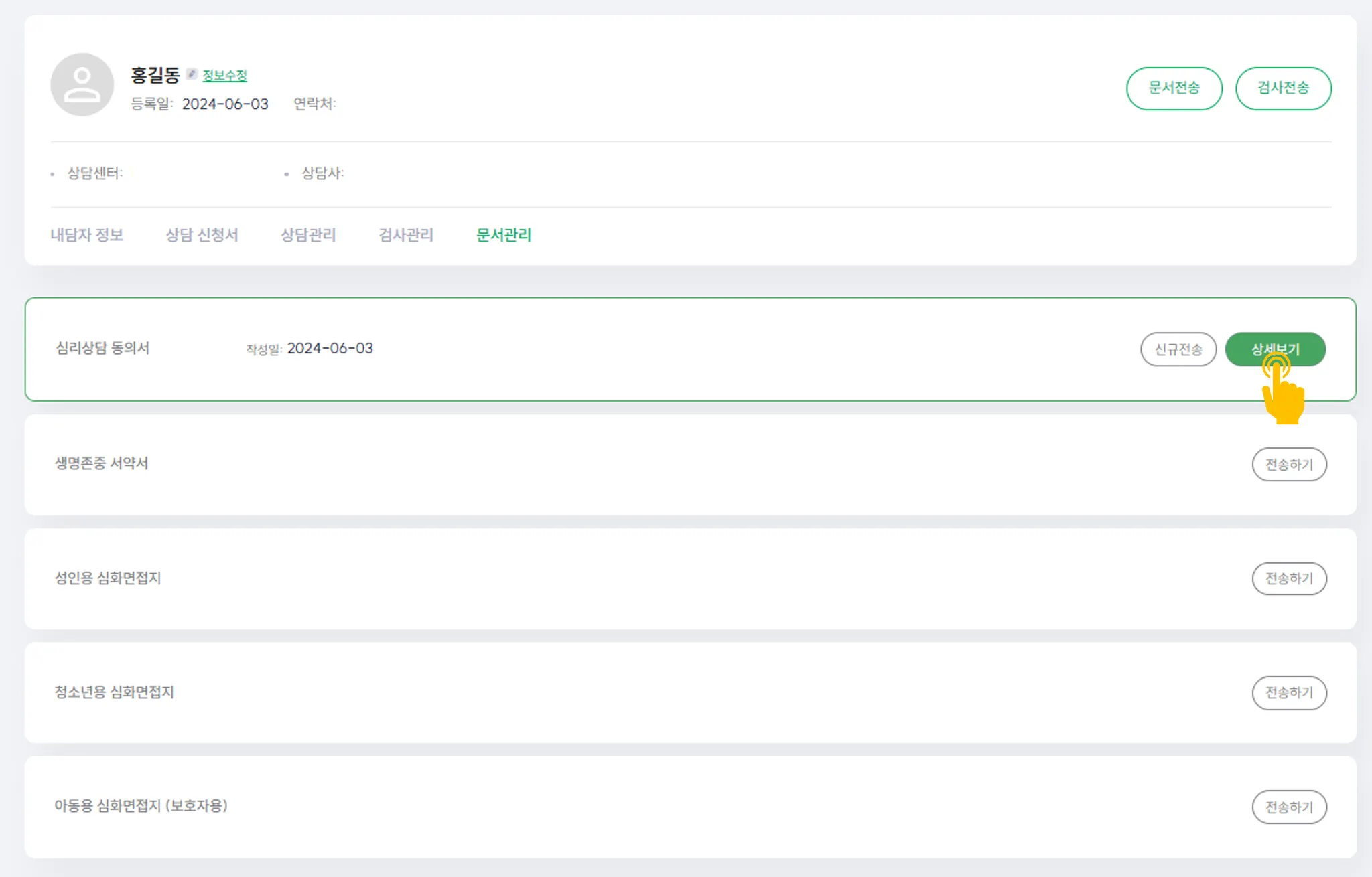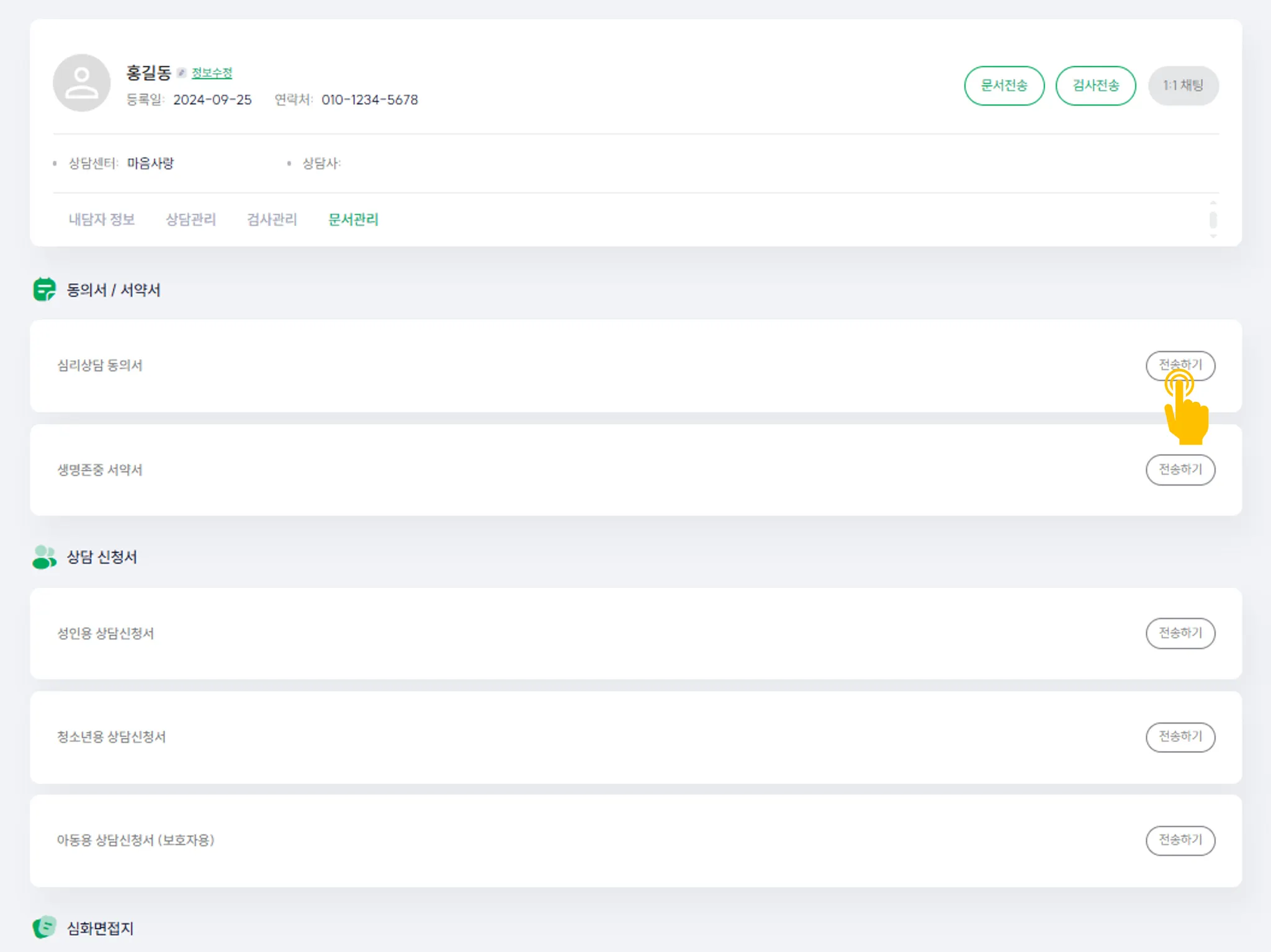 내담자에게 전송하고자 하는 문서 옆 [전송하기] 버튼을 클릭하세요.