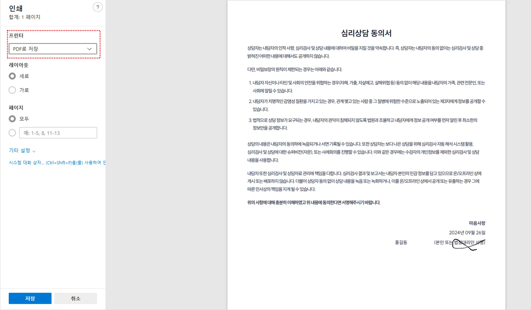 출력 프린터를 선택하세요. (PDF 저장을 원하시는 경우, 출력 프린터를 ‘PDF로 저장’ 선택)
