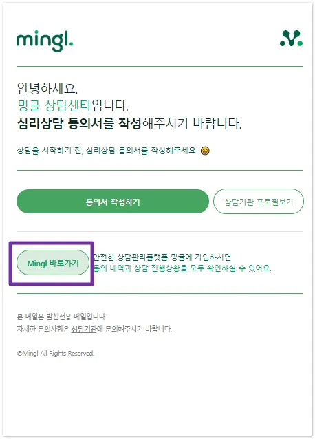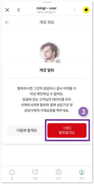 4) 밍글에 있는 고객님의 데이터를 모두 삭제하시려면 탈퇴와 함께 상담기관 및 상담사에게 삭제 요청을 해주세요.