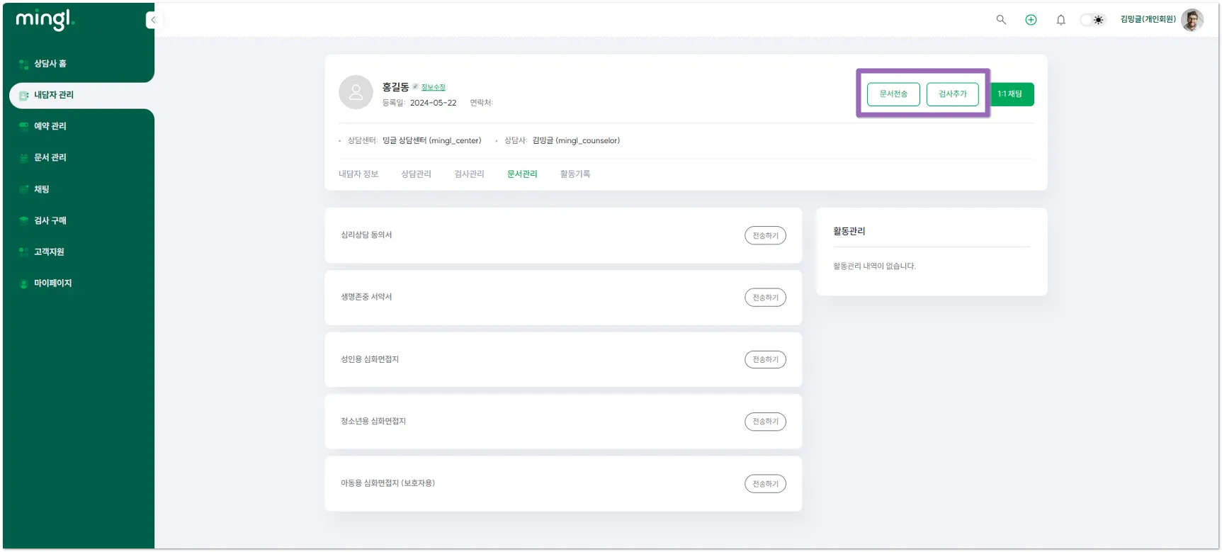 문서 또는 검사 발송 시 내담자에게 전송되는 알림톡/메일에 초대 링크가 포함되어 있어요.