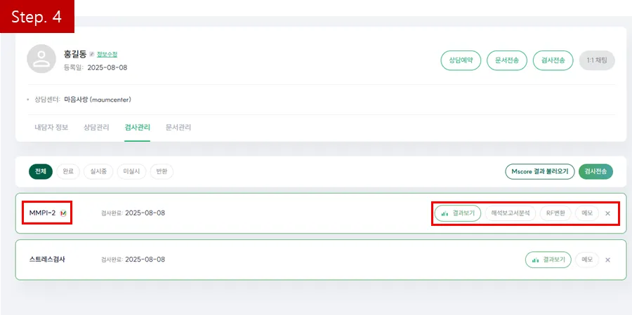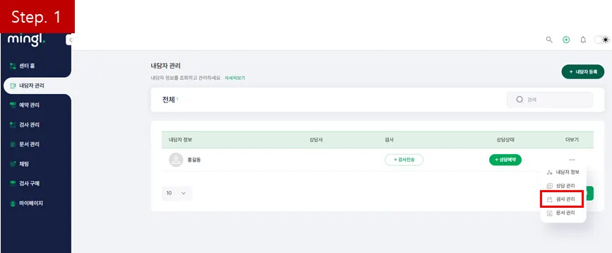 내담자 관리 > 더보기 > 검사 관리를 클릭하세요.