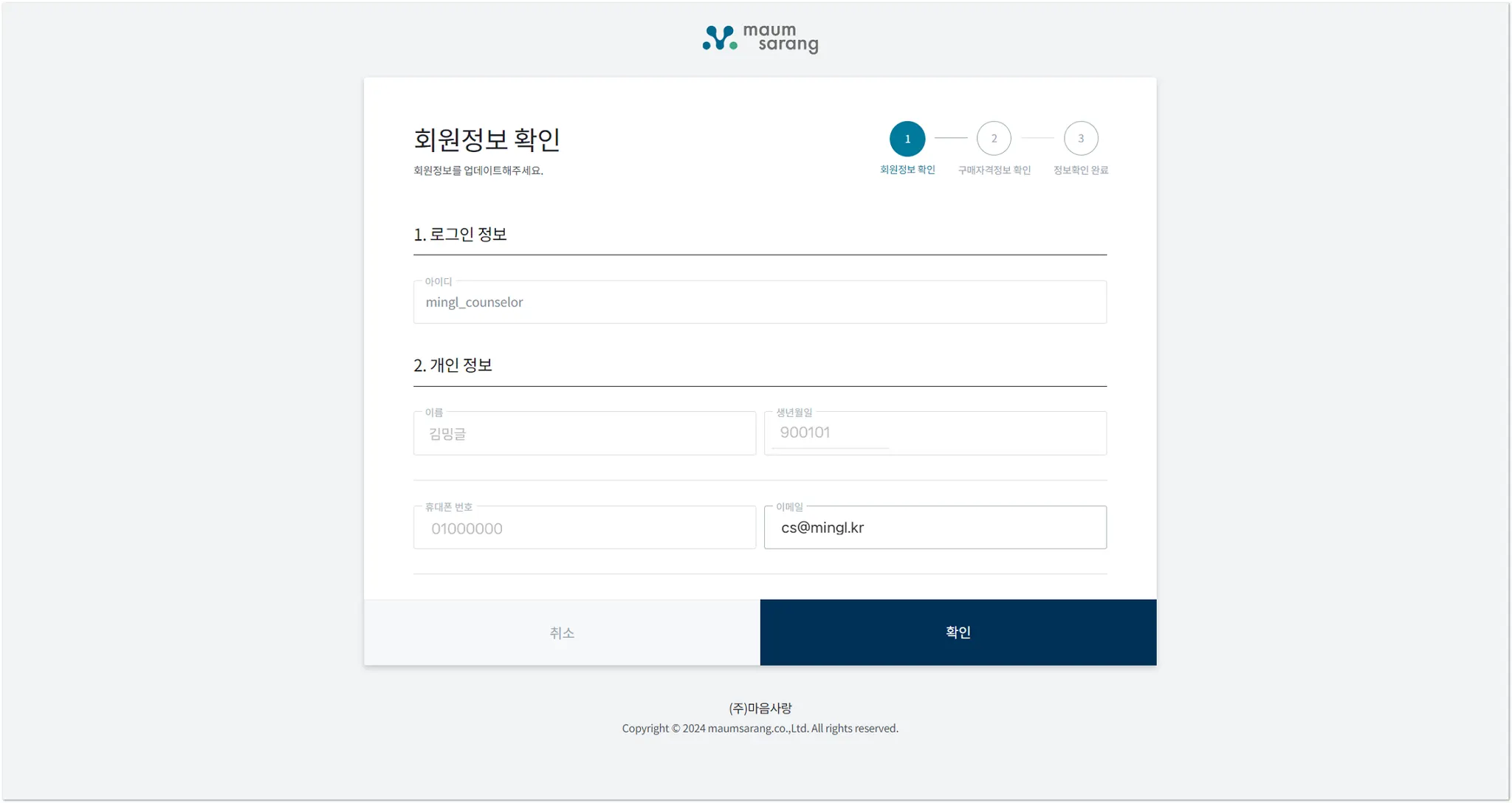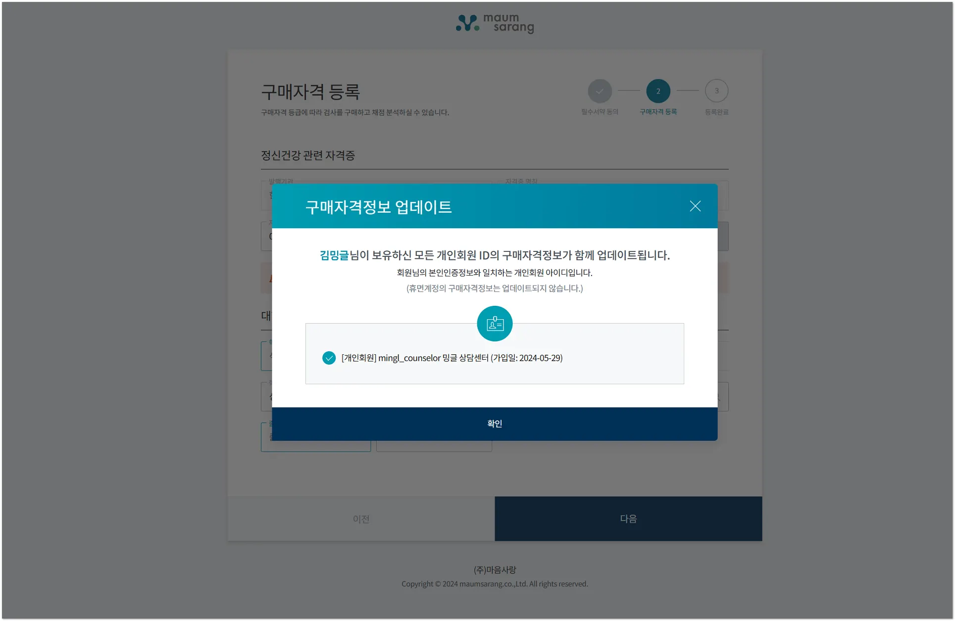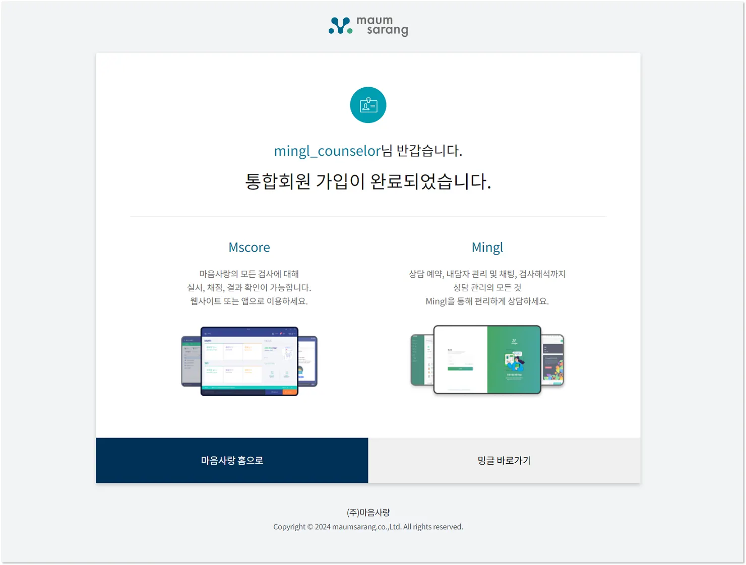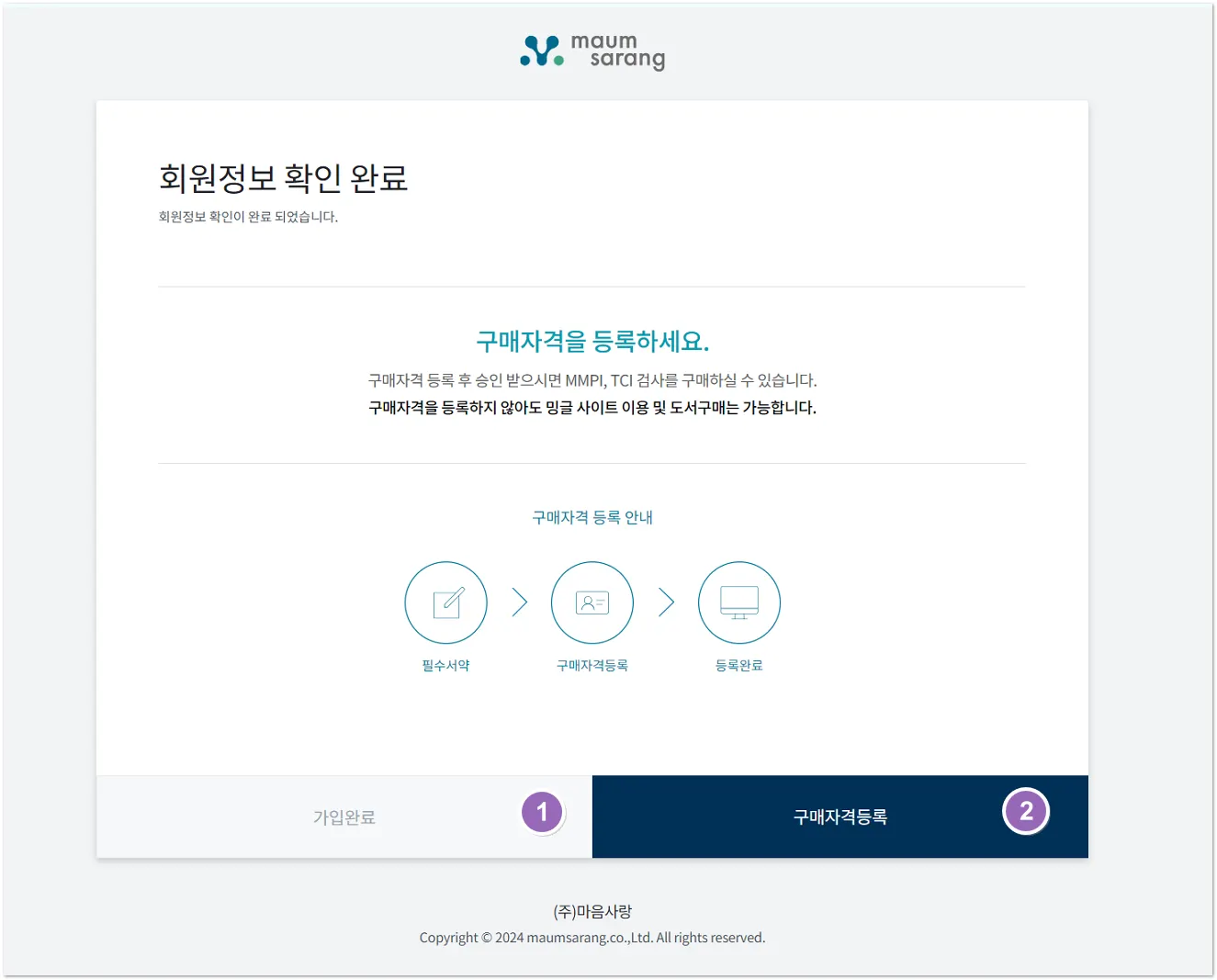 회원정보 확인이 완료되었습니다. 밍글의 상담관리 서비스만 이용하실 회원은 [가입완료] 버튼을 눌러주시고, 검사 구매가 필요하신 경우 [구매자격등록] 버튼을 클릭해 주세요.