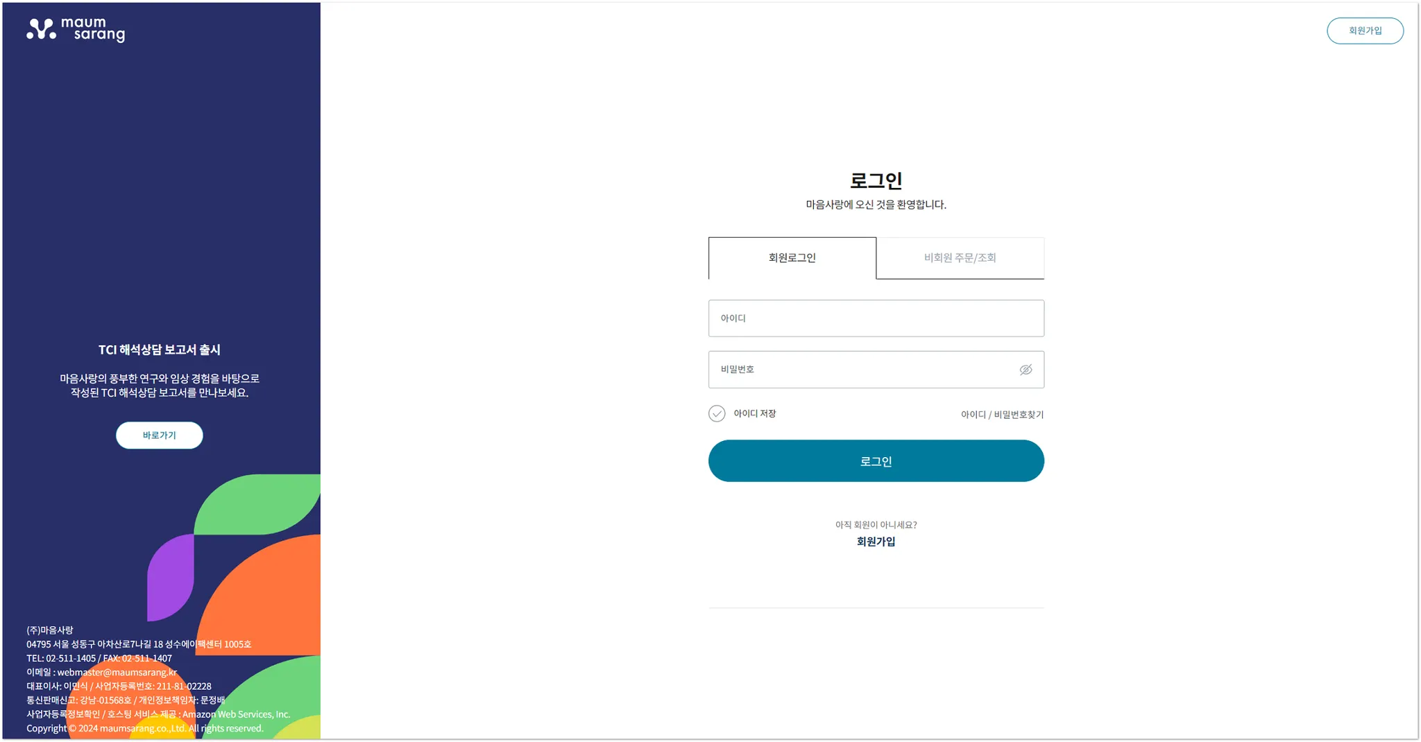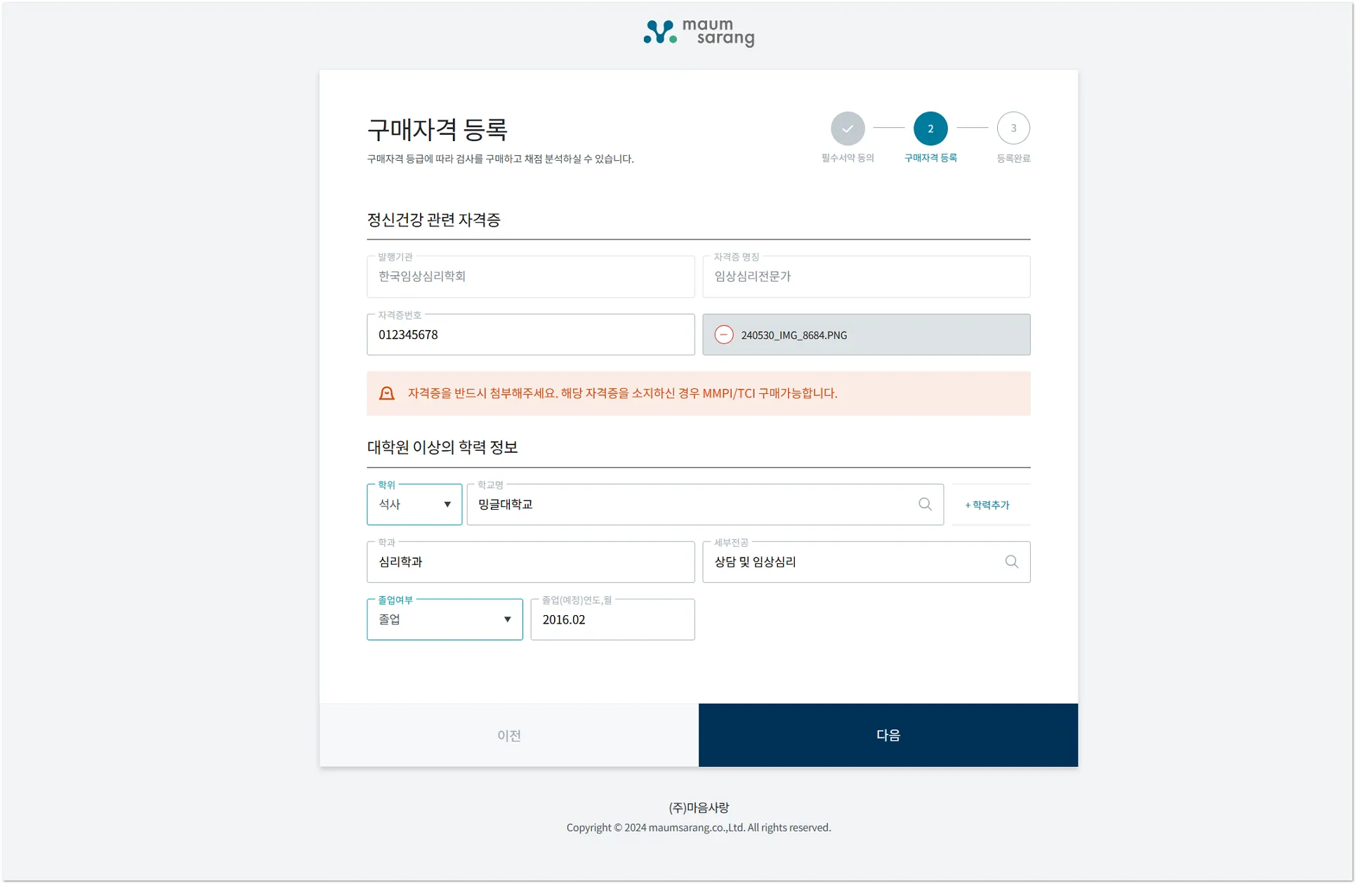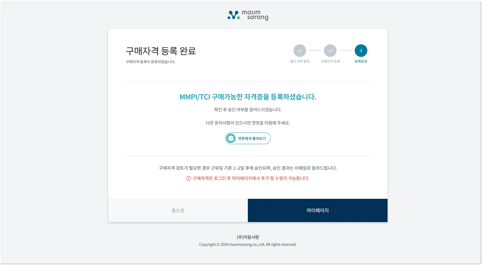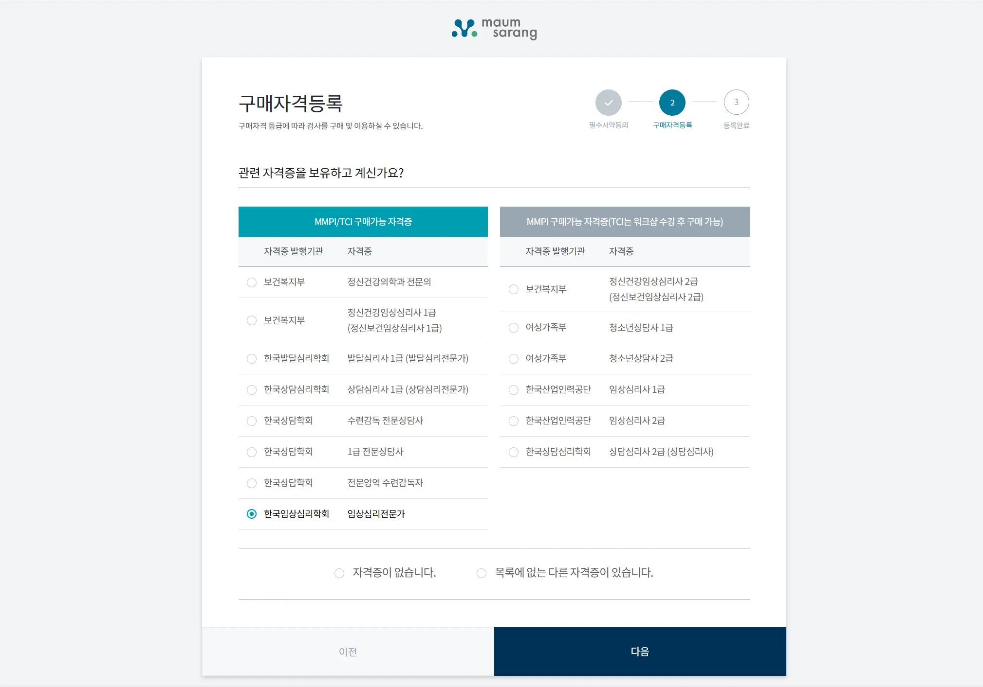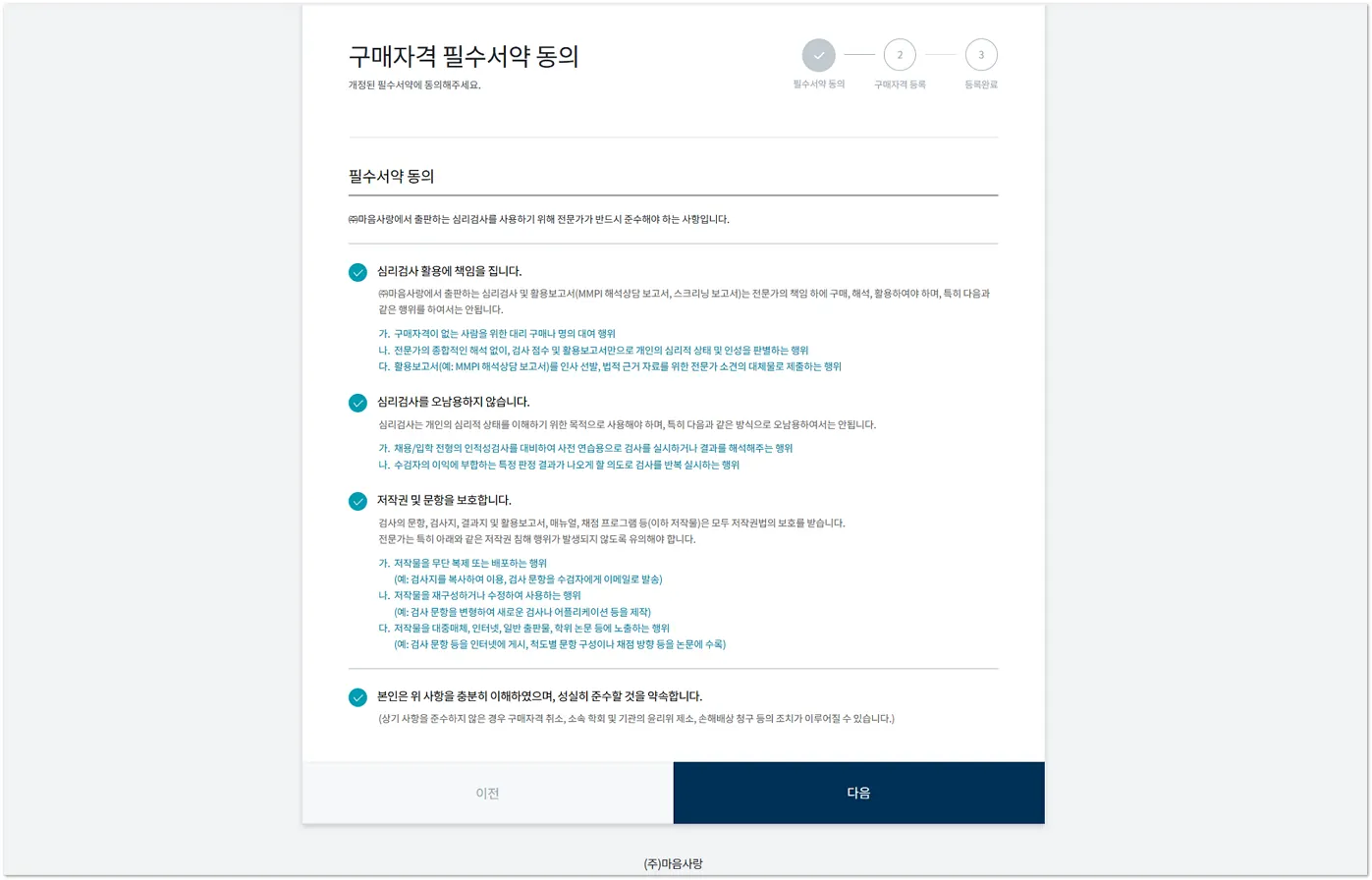 [구매자격등록] 버튼을 누르면 MMPI/TCI 검사 구매를 위해 필요한 동의, 정보 입력 절차가 진행됩니다.