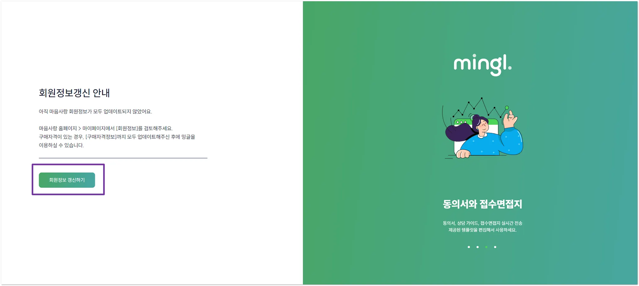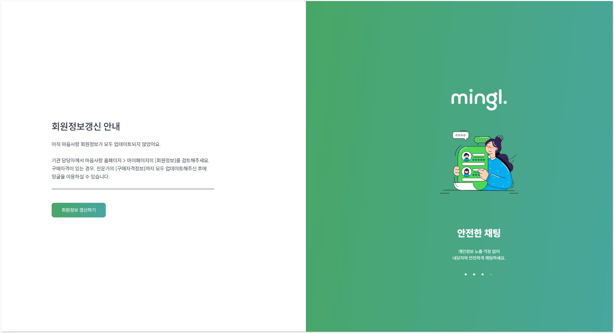 밍글 로그인 시 “회원정보갱신안내” 화면이 보이시나요? 갱신이 완료되어야 밍글을 사용하실 수 있어요.