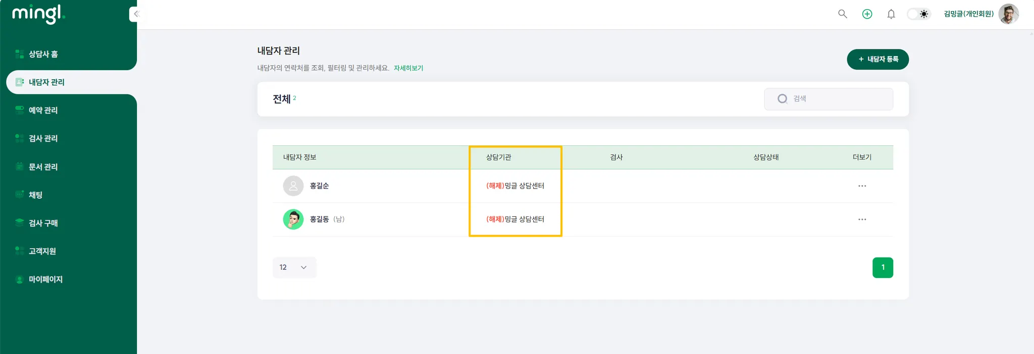 개인 아이디>내담자 목록에 “상담기관명(해제)”로 기록이 남습니다.