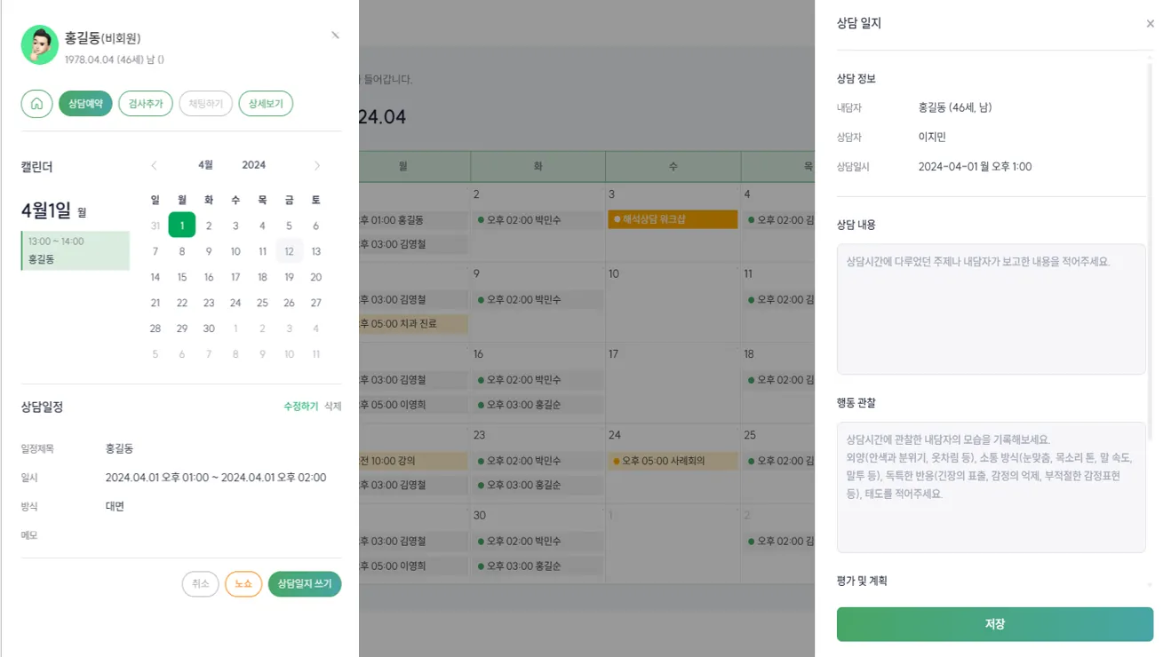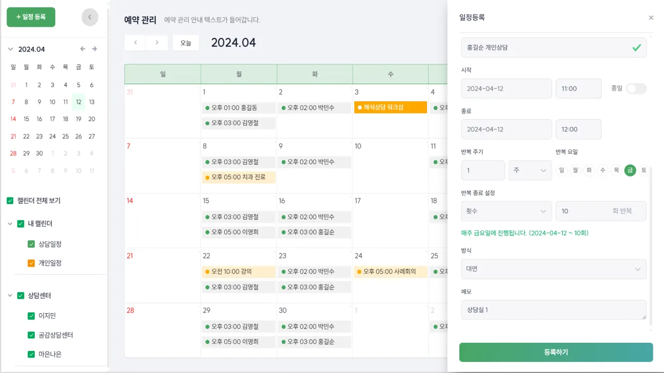 모든 센터의 내담자를 하나의 캘린더에서 예약하고 변경할 수 있어요.