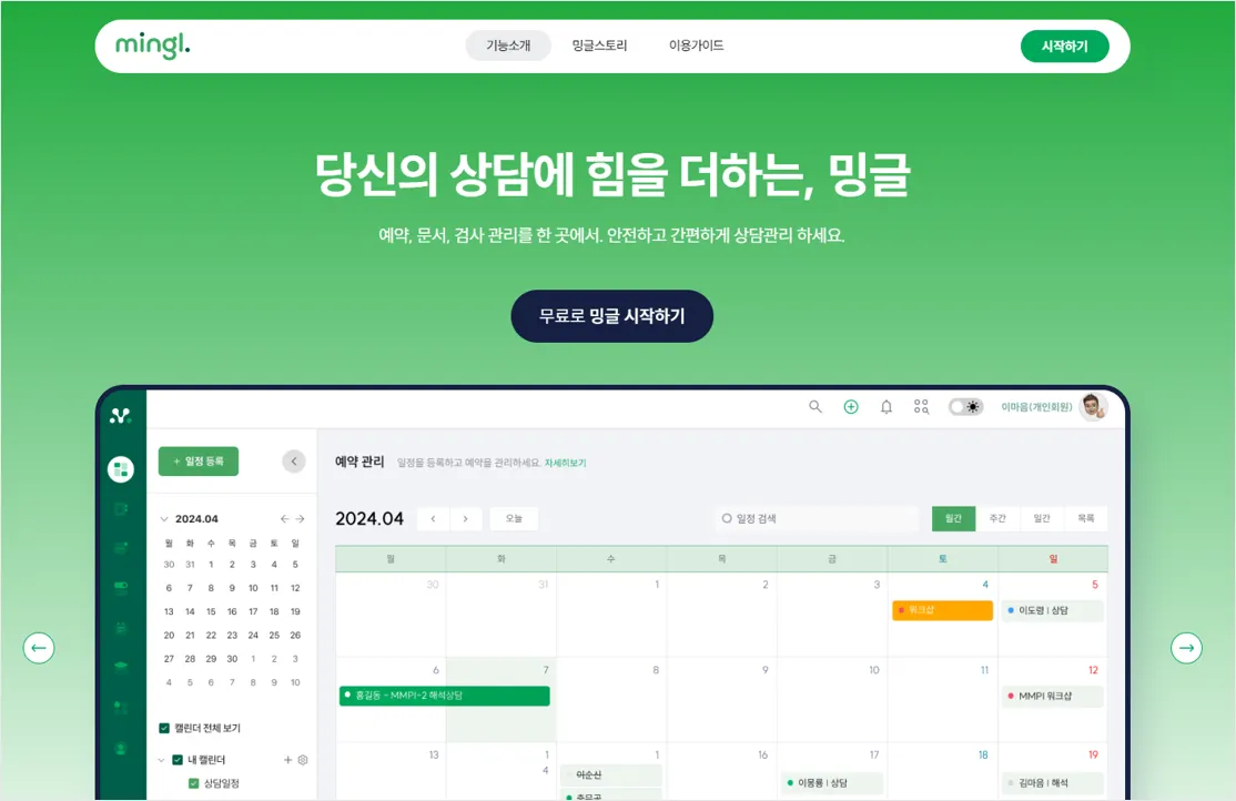 1인 상담센터의 상담자이자 운영자로서 혼자 모든 것을 관리하는 상황이 상당히 부담이었는데, "당신의 상담에 힘을 더하는, 밍글" 이라는 캐치 프레이즈를 보자 따뜻한 느낌이 들면서 든든한 지원군을 만난 것 같았습니다.