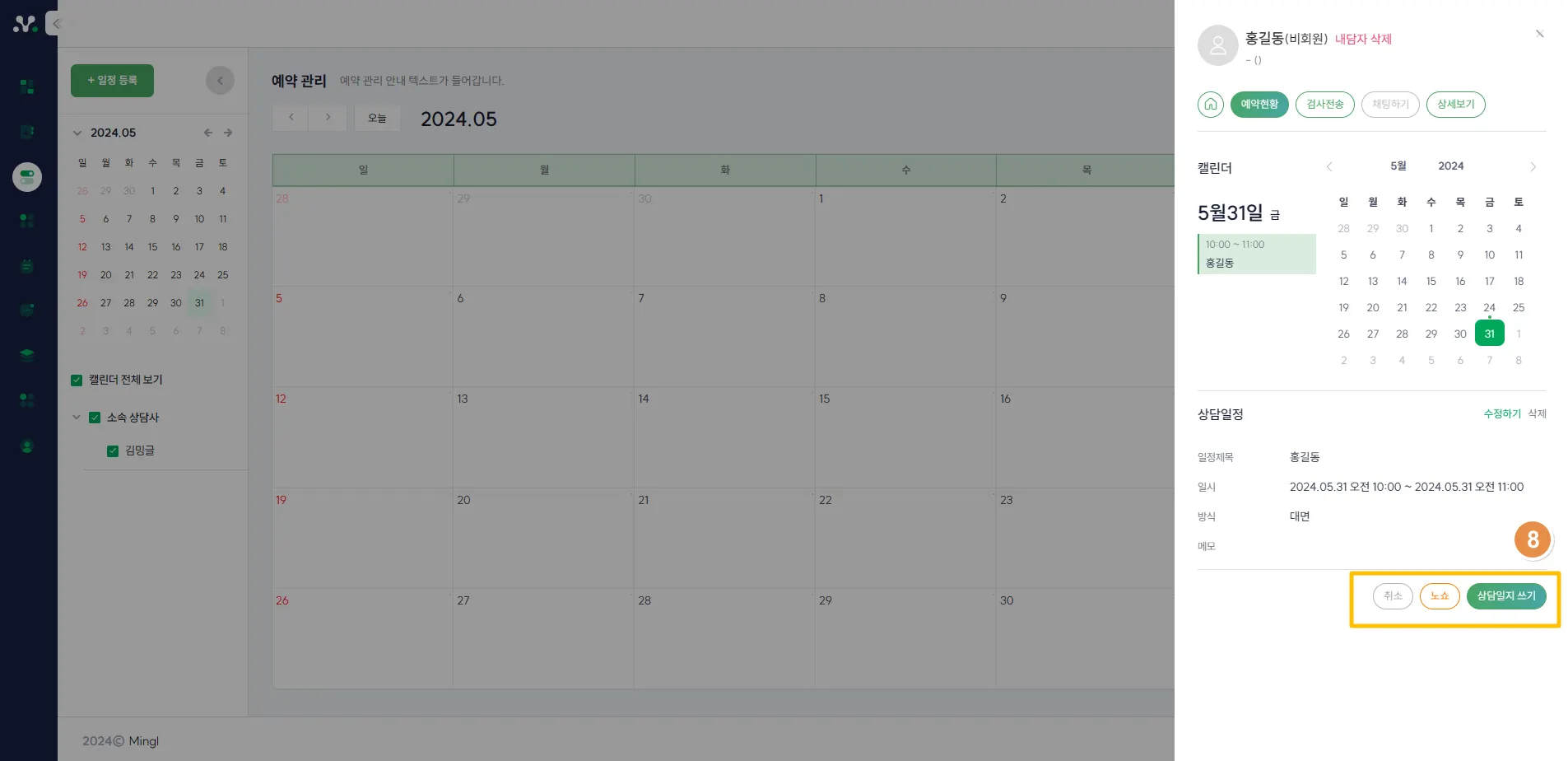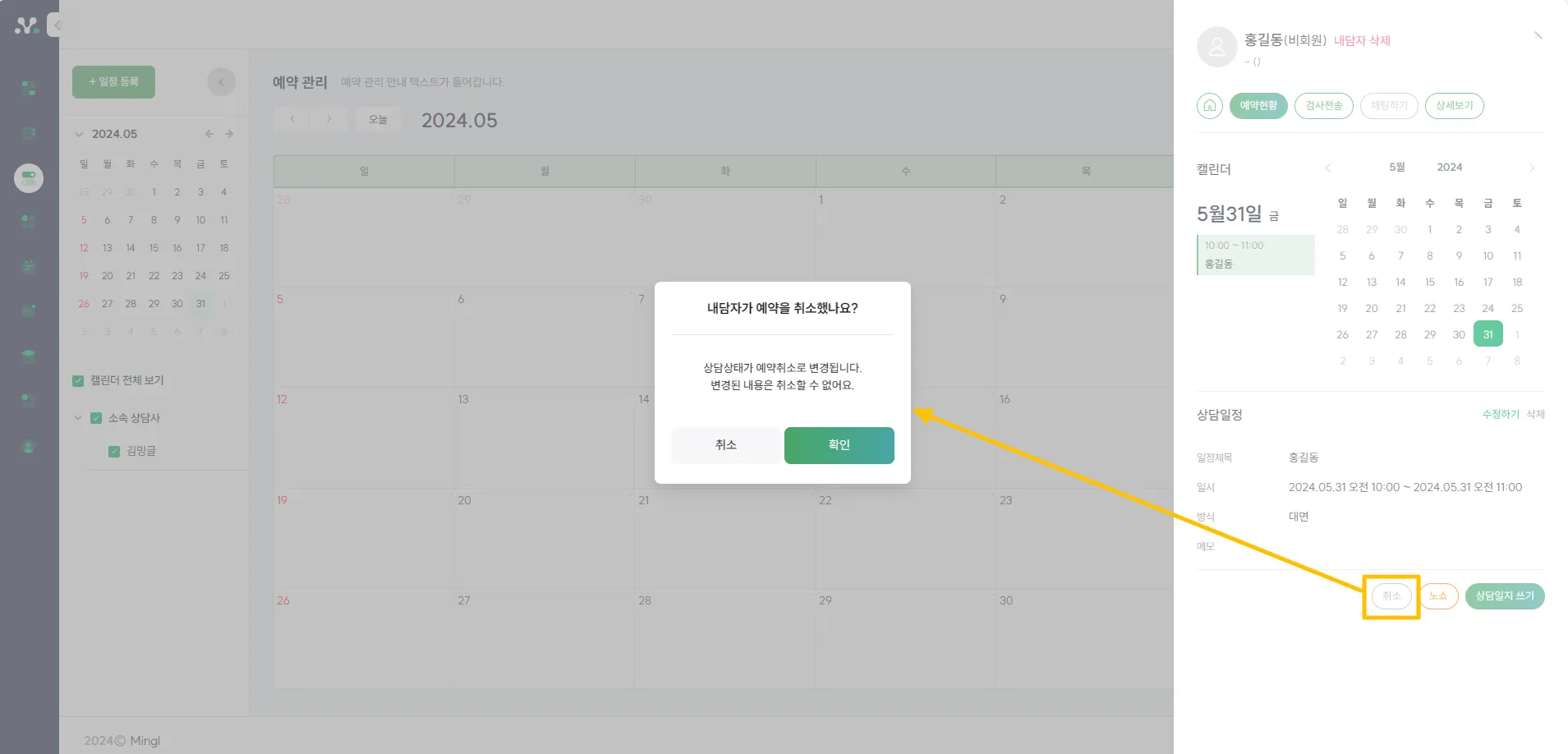 8) 내담자가 상담을 취소하거나 노쇼한 경우 <상담일정> 하단의 [취소], [노쇼] 버튼을 클릭하여 표시할 수 있어요.