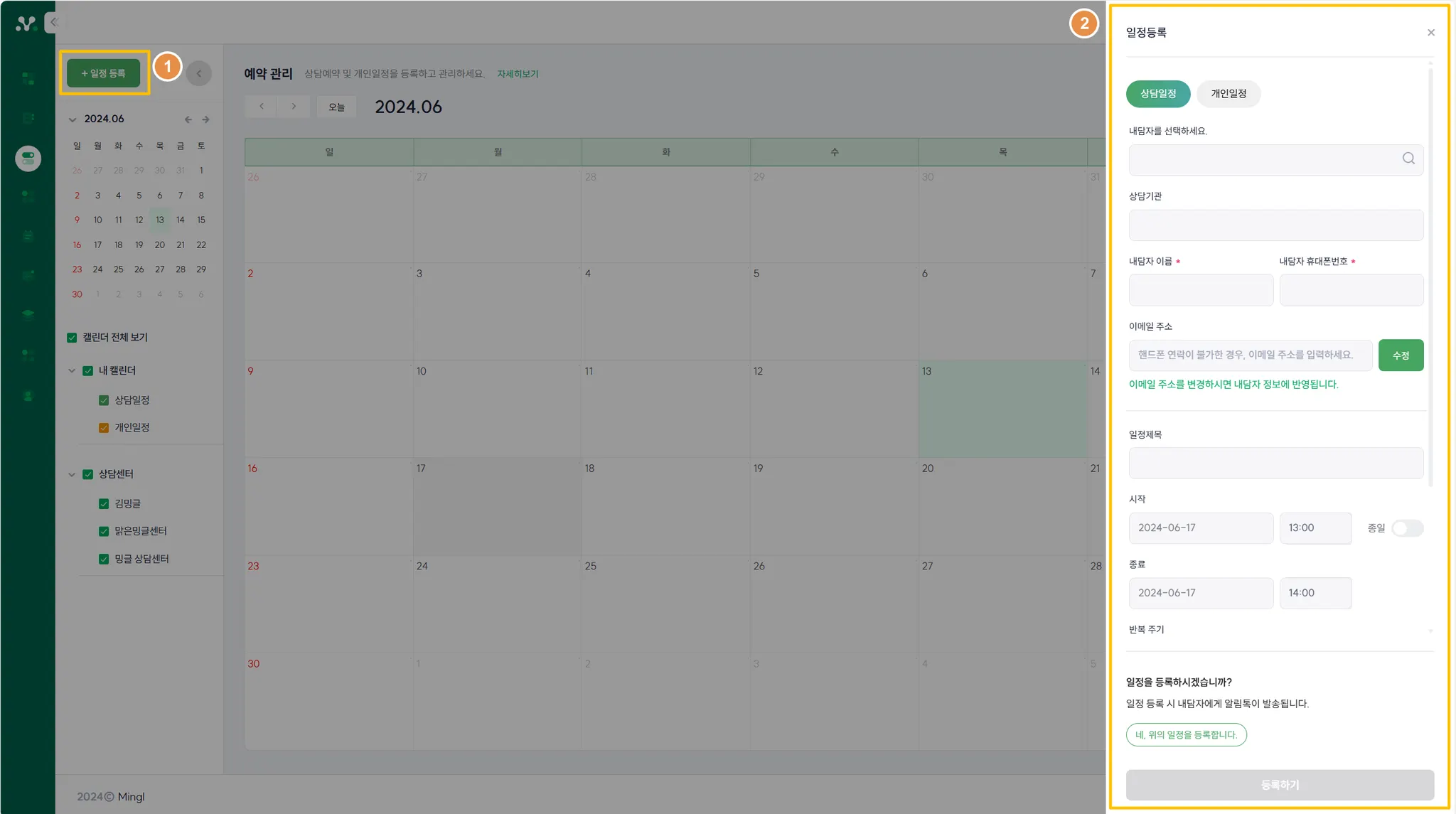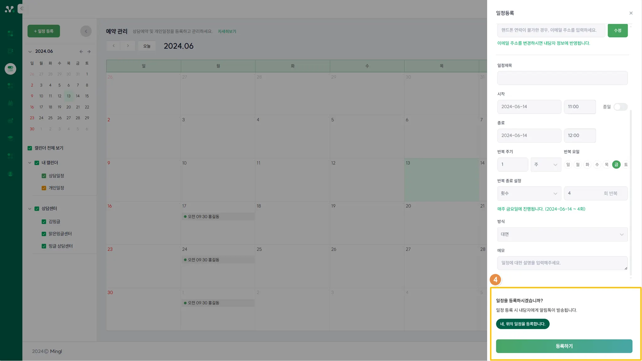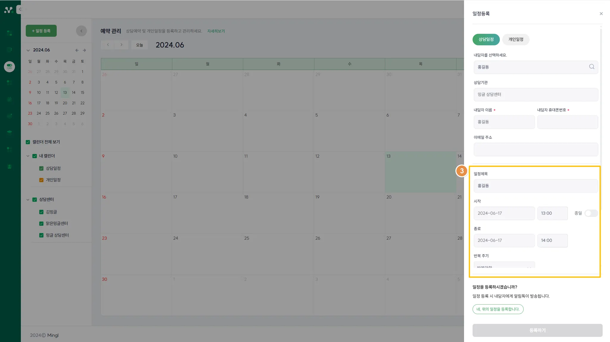 2) 내담자를 선택하고, 3)상담 일정과 반복 여부를 등록해 주세요.