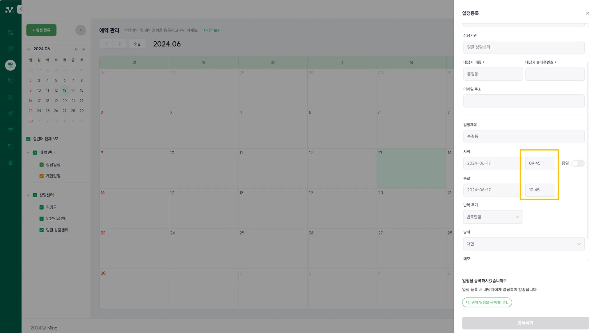 4) [등록하기]버튼을 누르면 내담자에게 알림톡이 발송됩니다