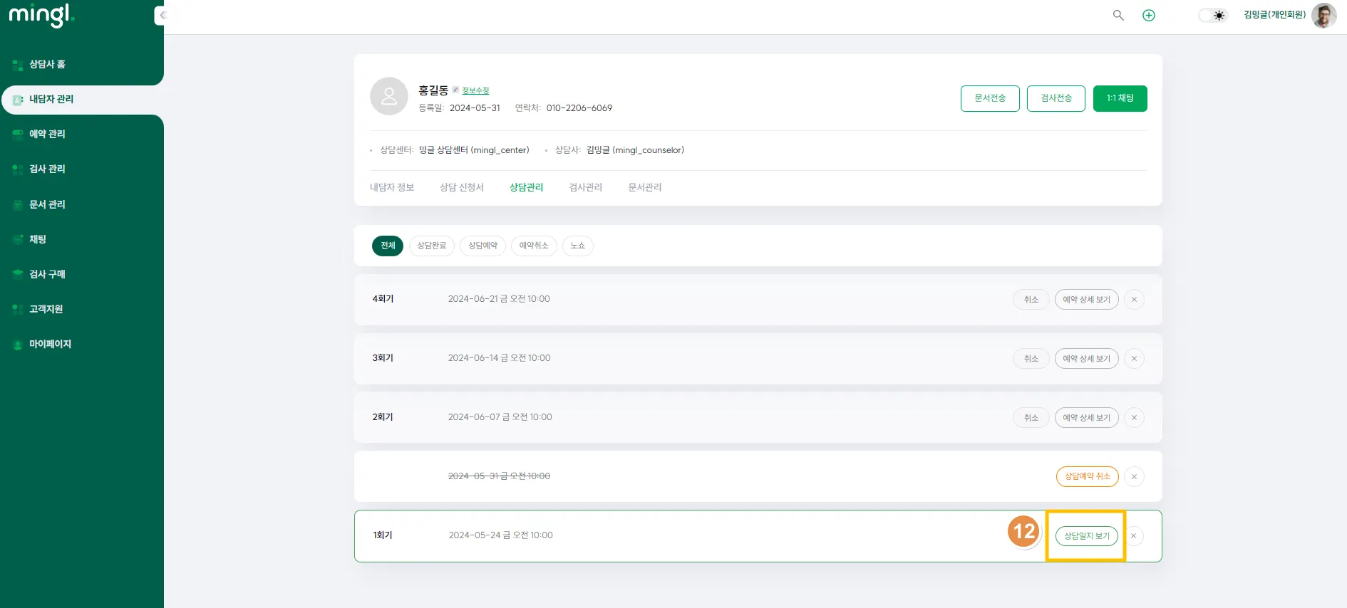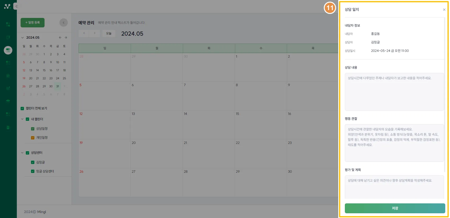 11) 개인 ID에서 상담 일지를 작성해 보세요.
