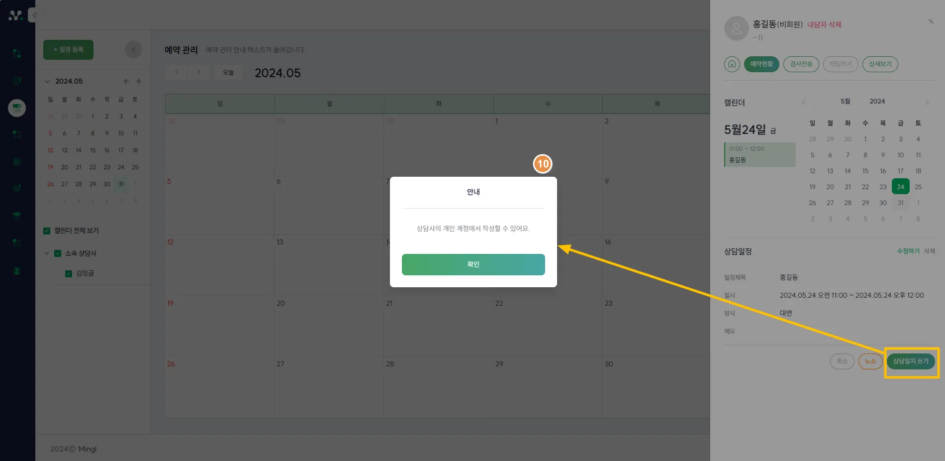 10) “상담 일지 쓰기”는 상담사의 개인 ID에서만 가능해요.