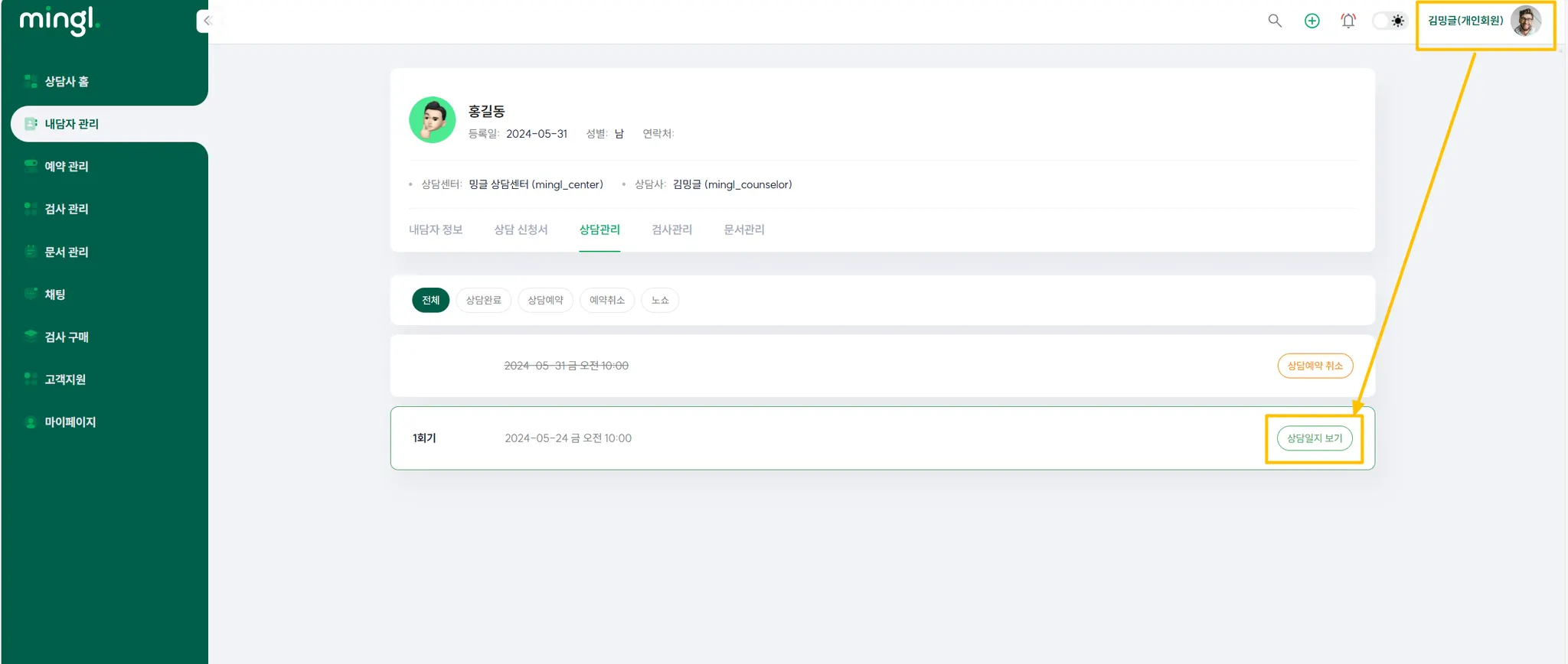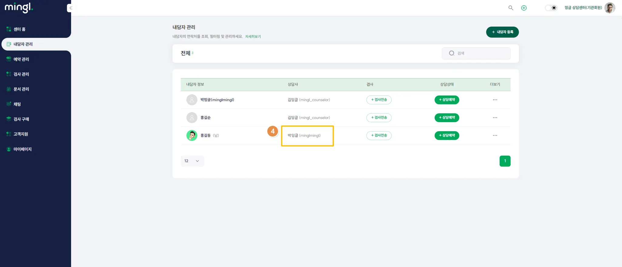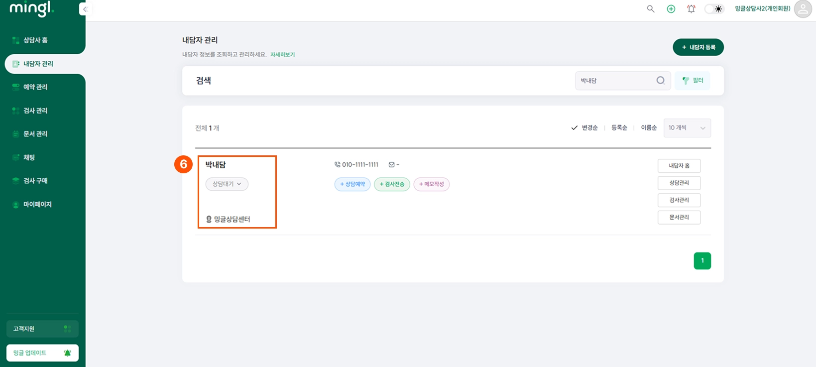6) 새로 내담자를 맡게 된 (new) 상담사가 개인 ID로 로그인하면 아래와 같이 내담자가 배정되어 있습니다.