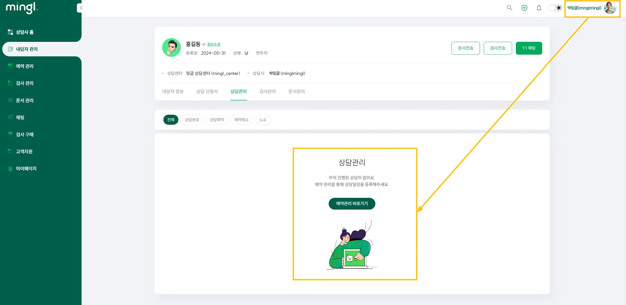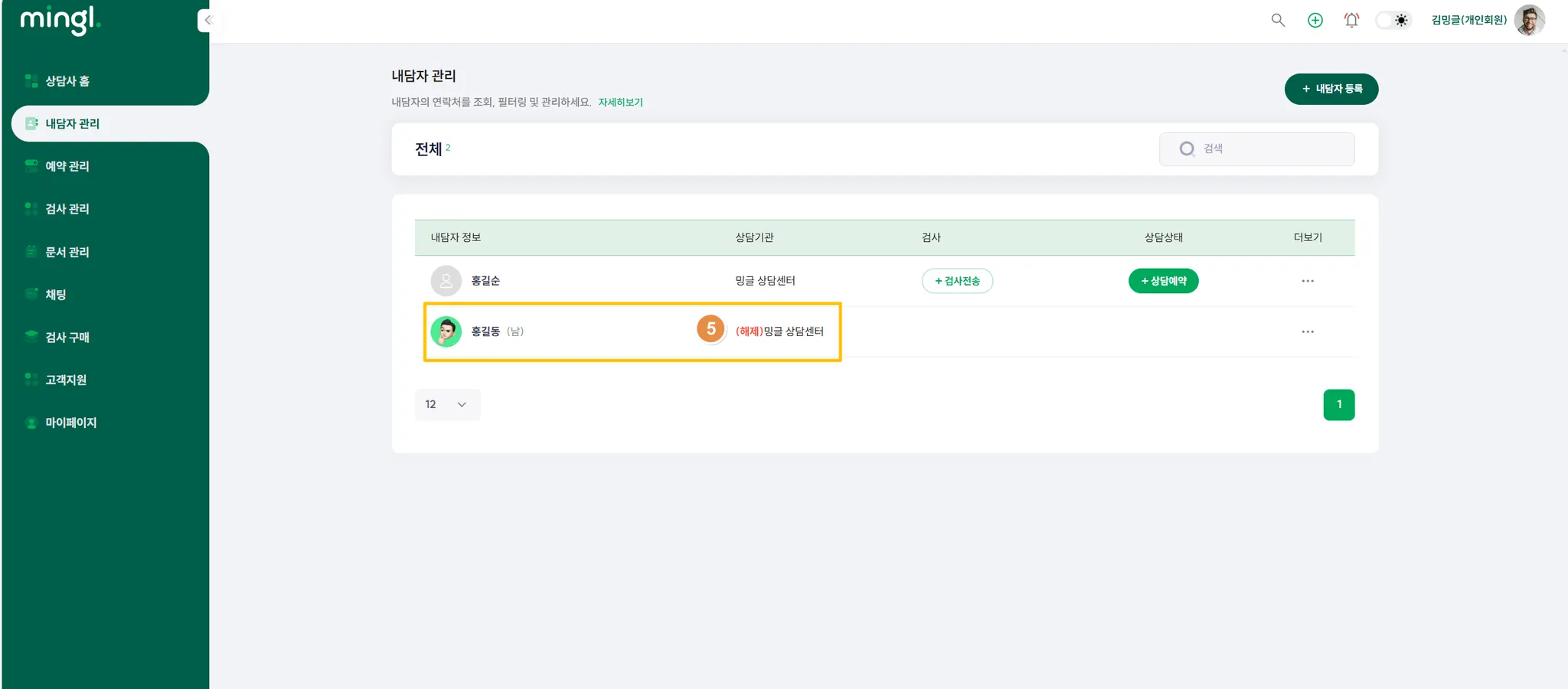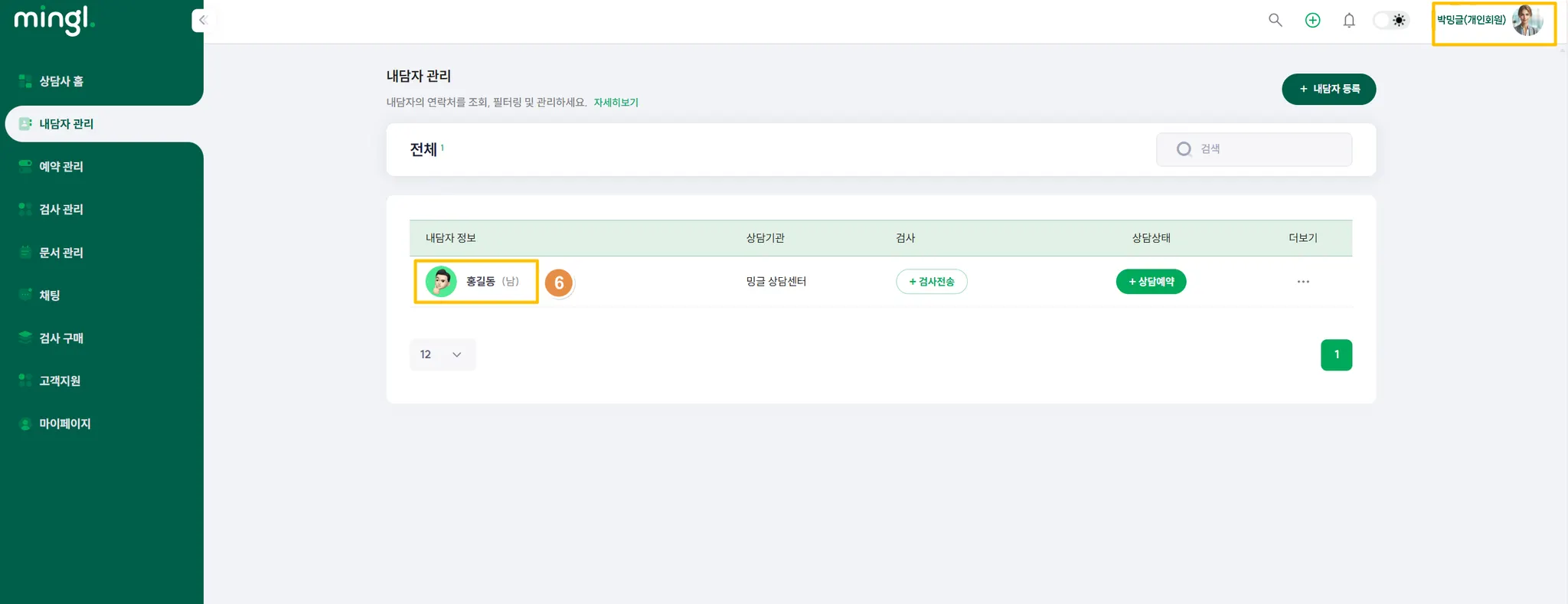 6) 새로 내담자를 맡게 된 (new) 상담사가 개인 ID로 로그인하면 아래와 같이 내담자가 배정되어 있습니다.