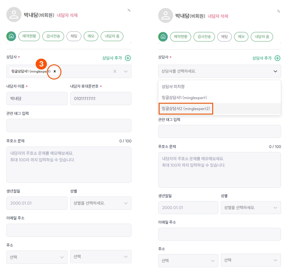 3) 기존 상담사를 X로 제거한 후, 변경할 상담사를 선택합니다.