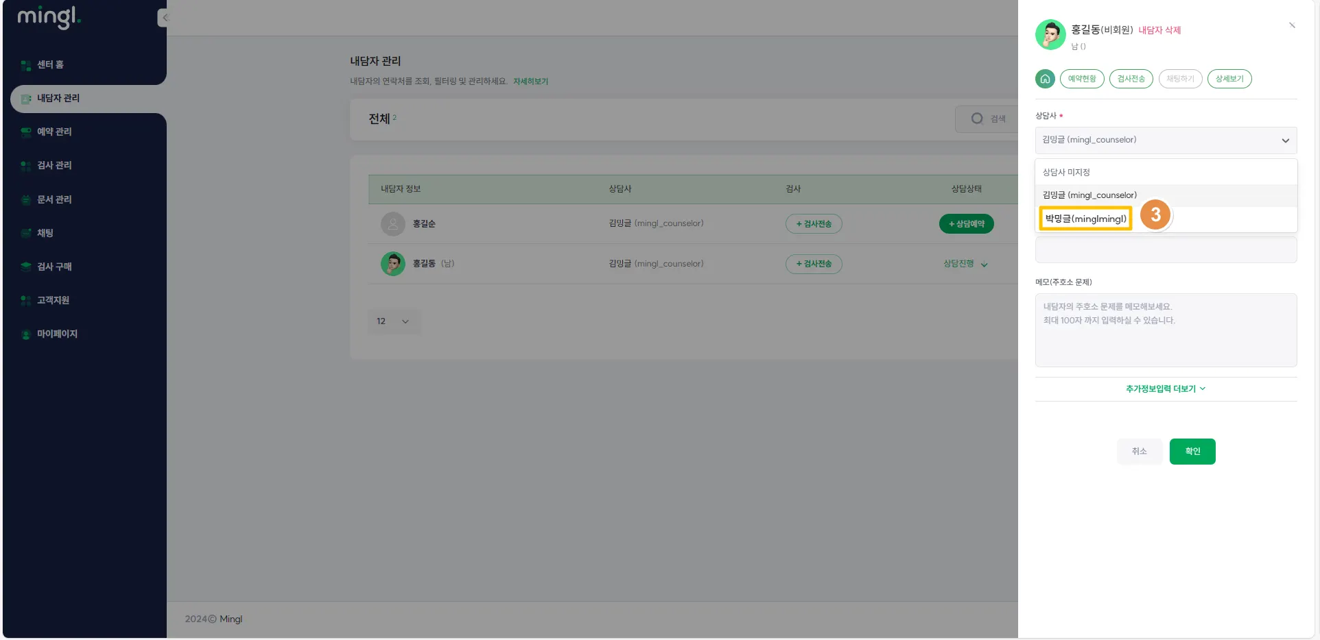 3) 변경할 상담사를 선택한 후>[확인]을 누릅니다.