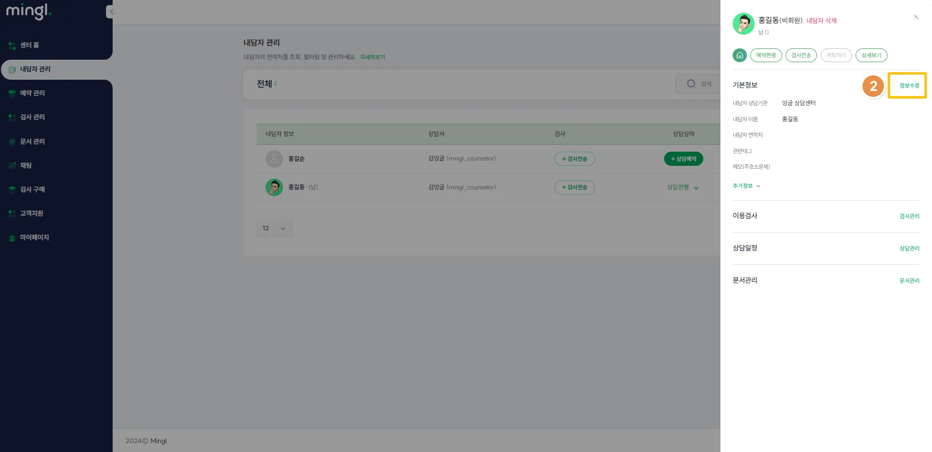 2) 내담자 기본 정보 > [정보수정]을 클릭해 주세요.