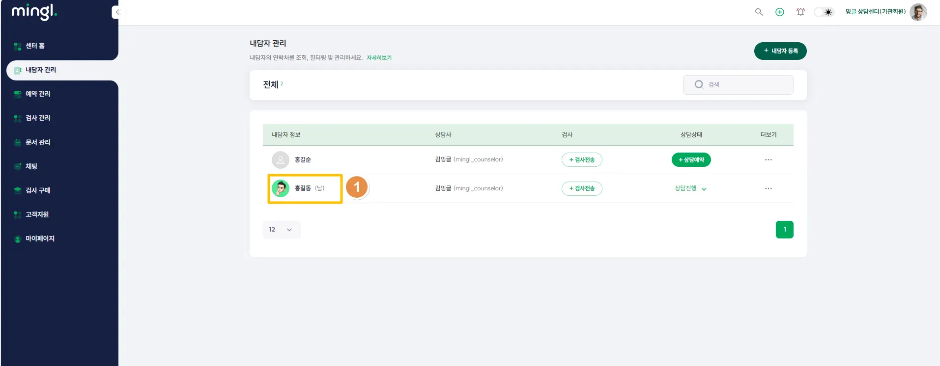 1) 기관 ID로 로그인 > [내담자 관리]에서 내담자를 선택합니다.