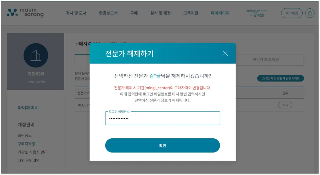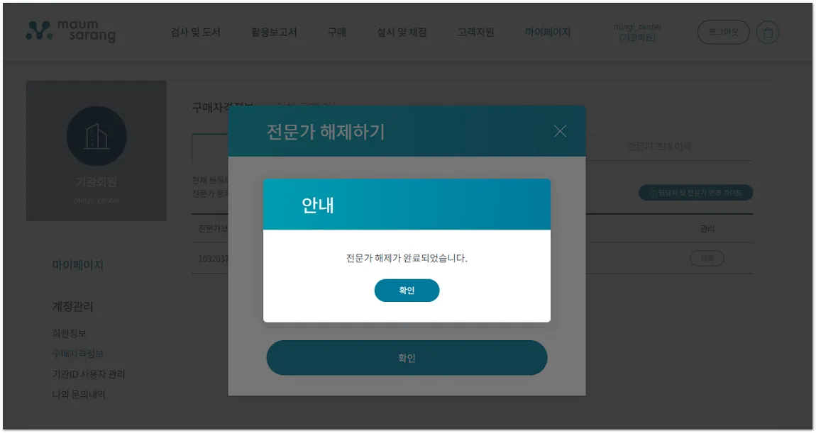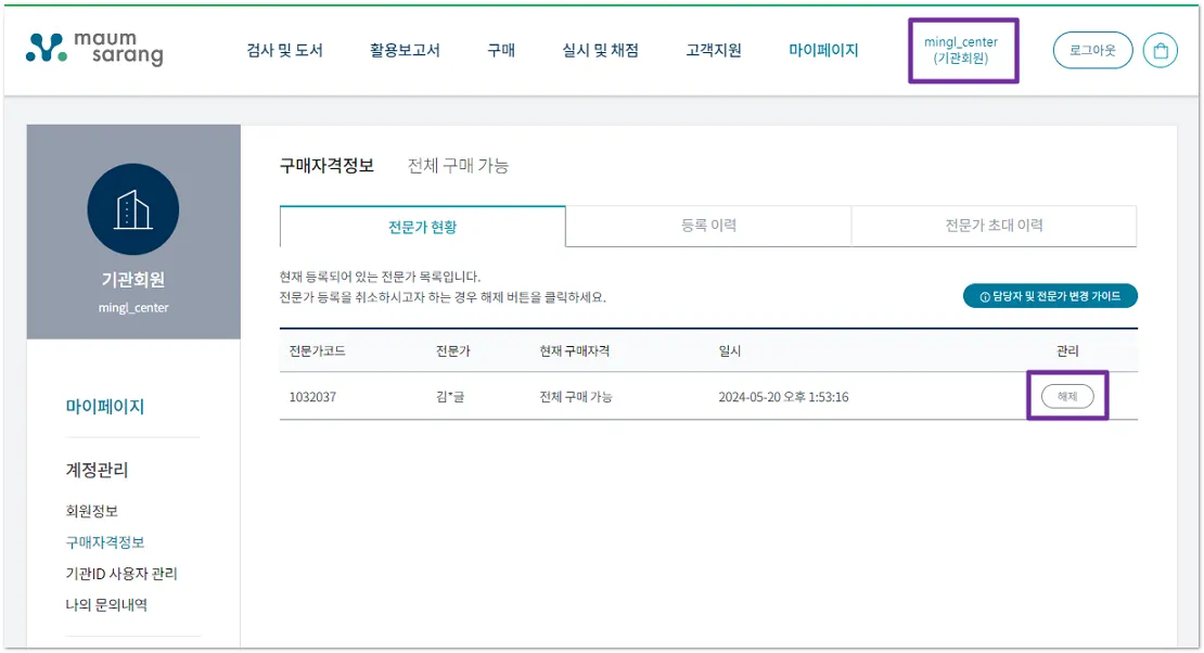 상담사가 기관 ID의 “전문가”로 등록되어 있는 경우 마음사랑 홈페이지>마이페이지>구매자격정보>[전문가 현황]에서 “전문가 해제”를 별도로 진행해 주세요.