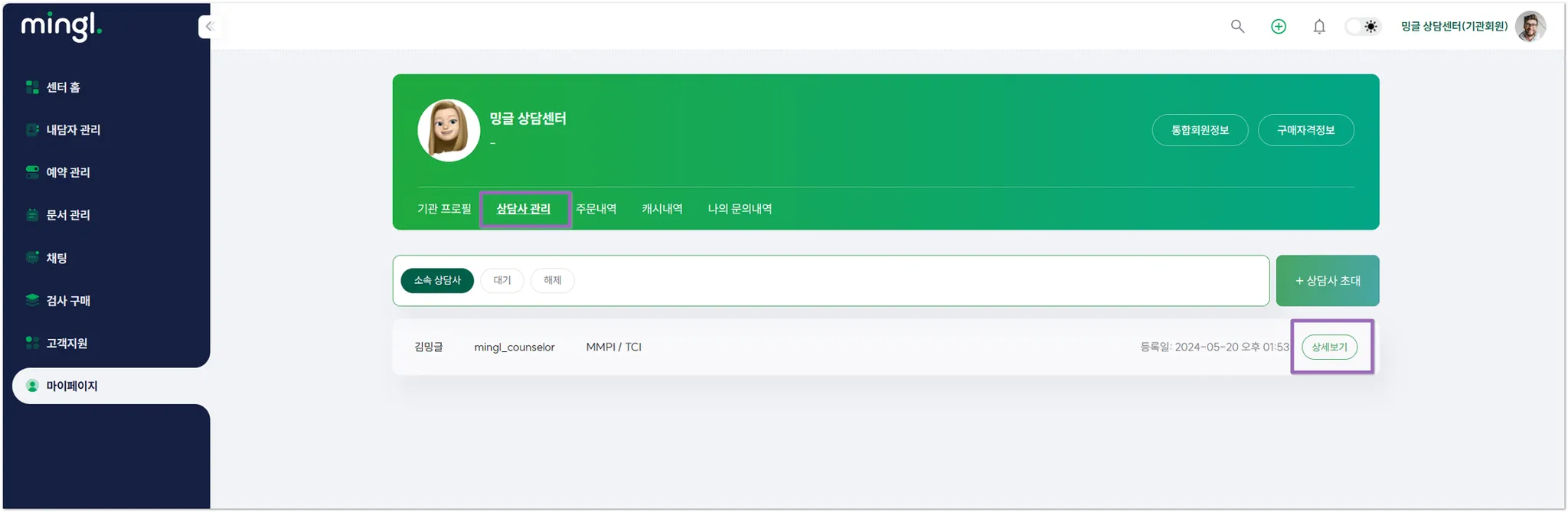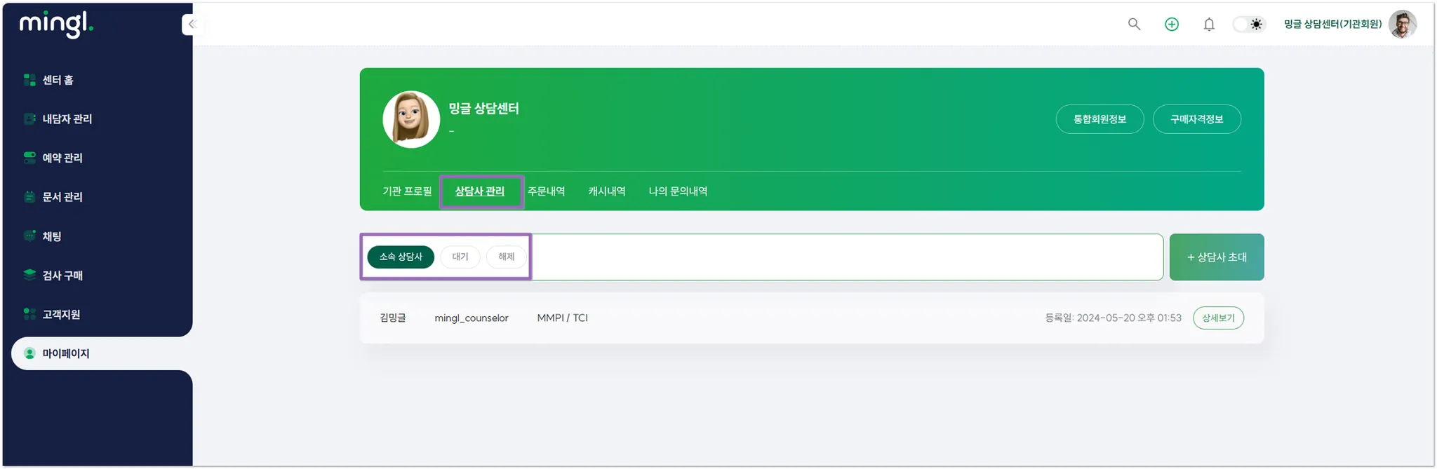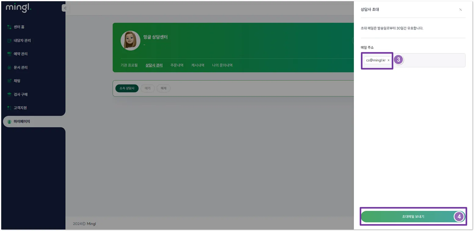 밍글 기관 ID로 로그인 > 마이페이지>상담사 관리>[상담사 초대] 버튼 클릭하여 초대할 상담사의 이메일을 입력하면 상담사에게 초대 링크가 발송됩니다.