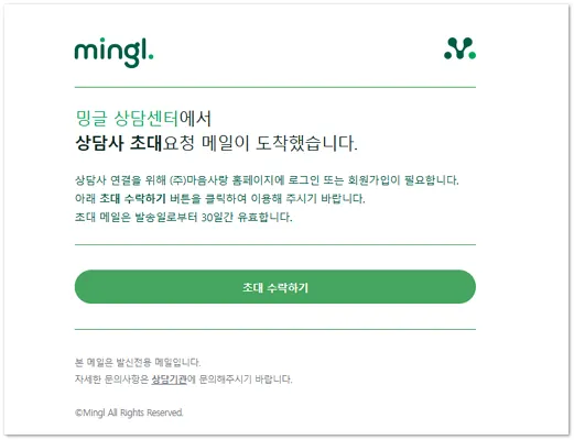 상담사에게 발송한 이메일에서 [초대 수락하기] 버튼을 클릭하면 밍글 로그인 화면으로 연결됩니다.