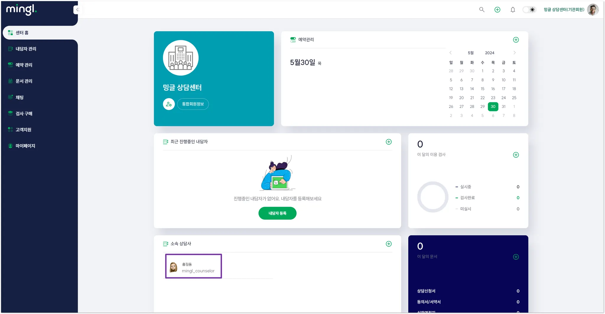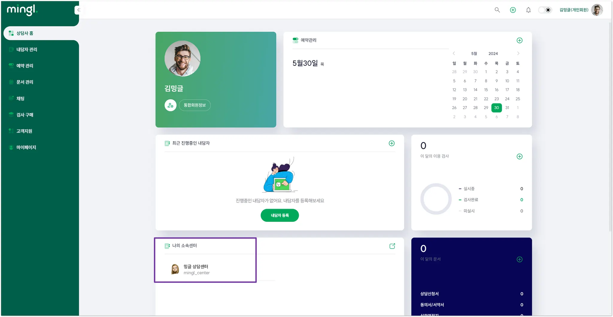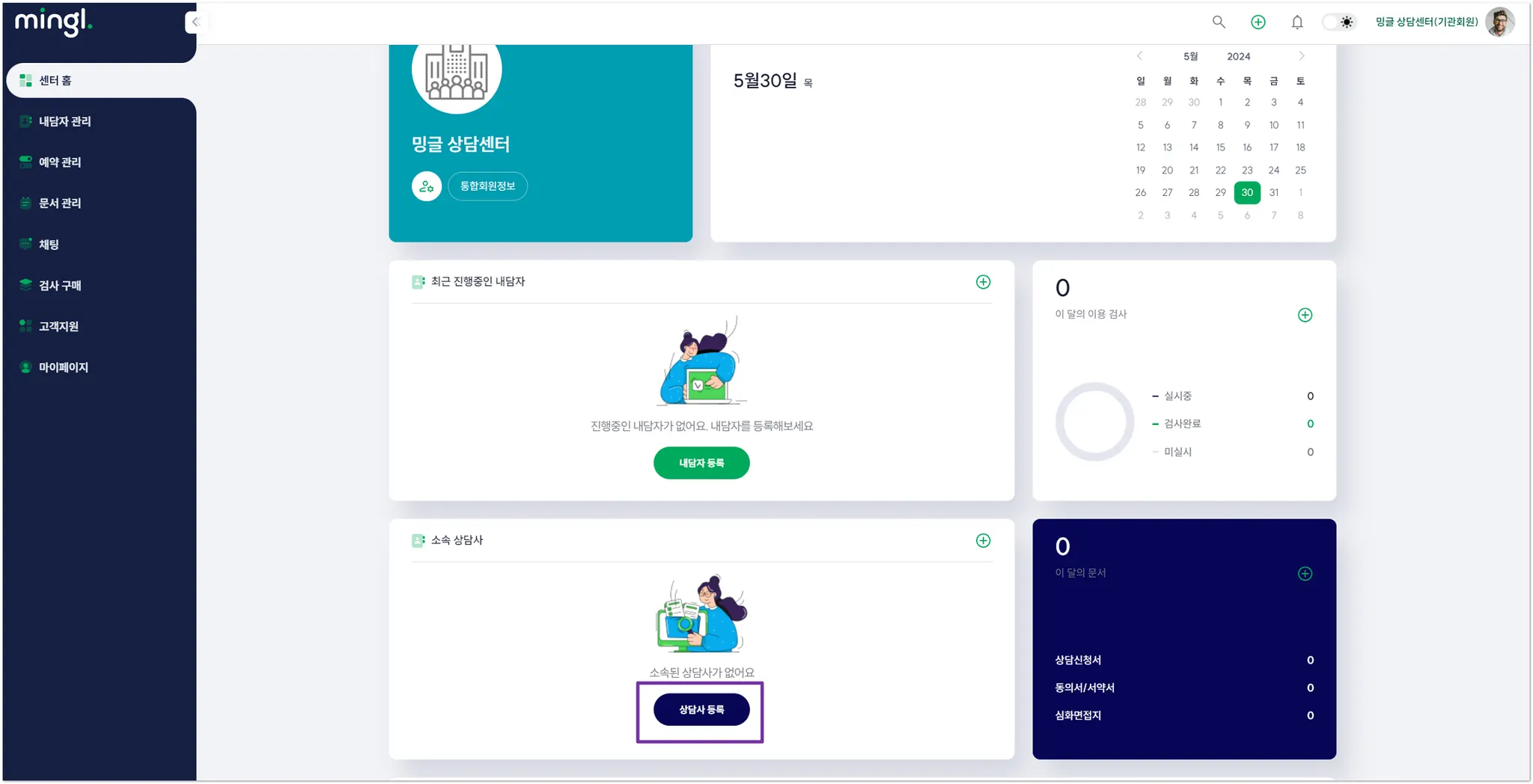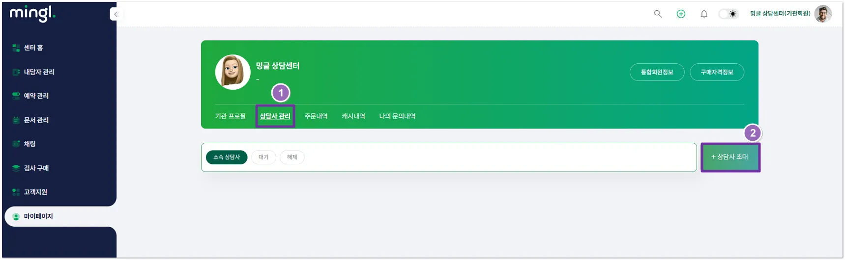 기관회원으로 밍글 서비스를 이용하려면 먼저 ‘상담사’를 등록해주세요.