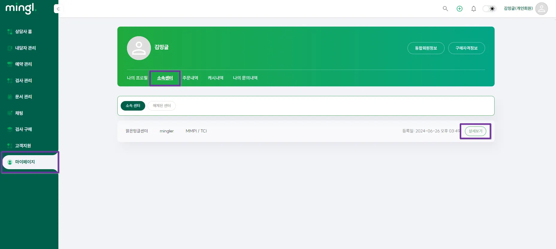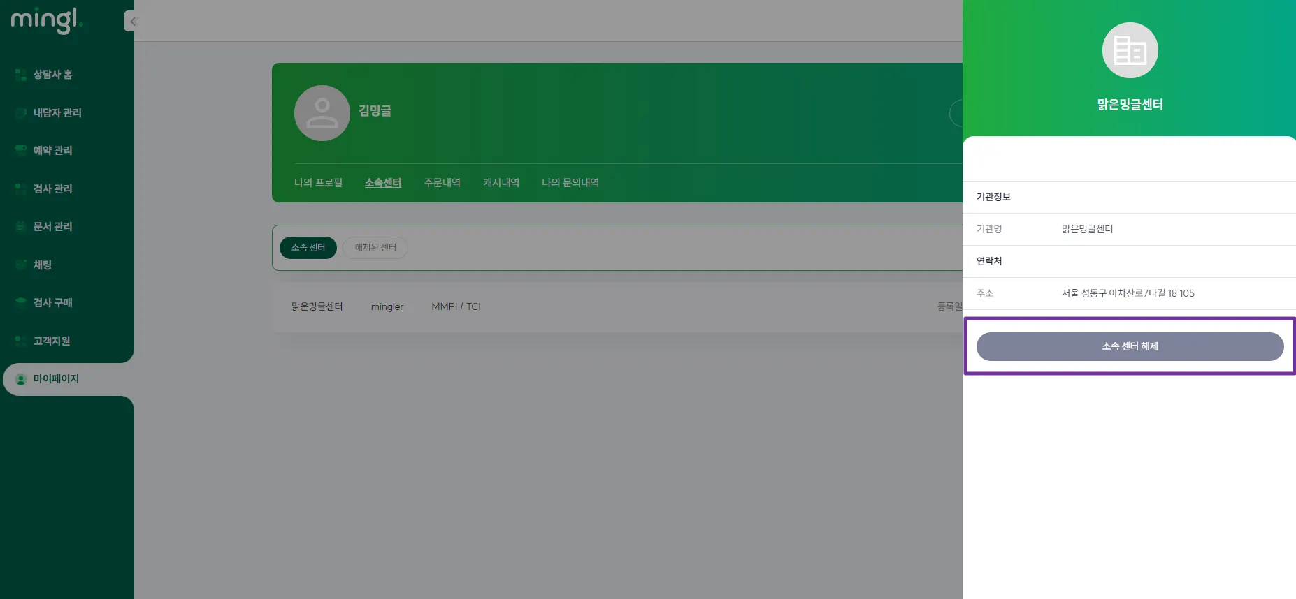 개인 ID로 로그인>마이페이지>소속센터>소속센터 리스트에서 [상세보기] 버튼 클릭>[소속 센터 해제] 메뉴에서 센터를 해제할 수 있습니다.