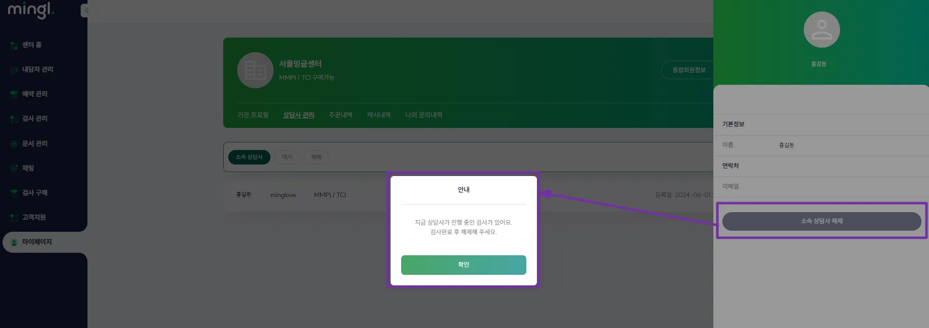 단, 검사실시 중인 경우(미실시/실시중/일시중지)에는 상담사 해제가 불가해요!