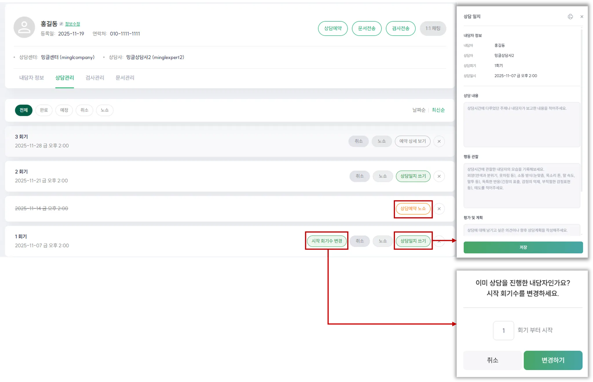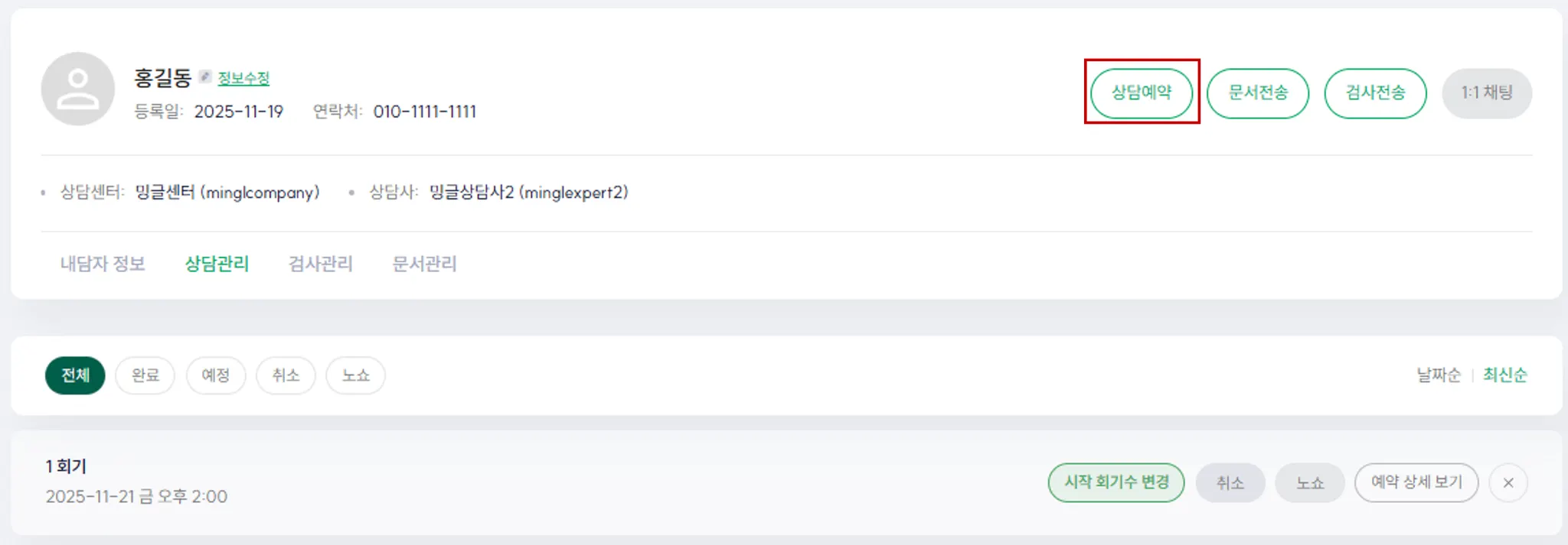 내담자가 상담을 취소하거나 노쇼하면 [예약취소], [노쇼]로 기록하세요.