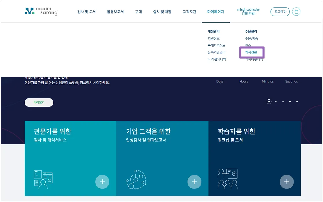 15일이 경과된 취소가 어려운 상품은 아래의 [캐시 전환]을 참고해주세요.