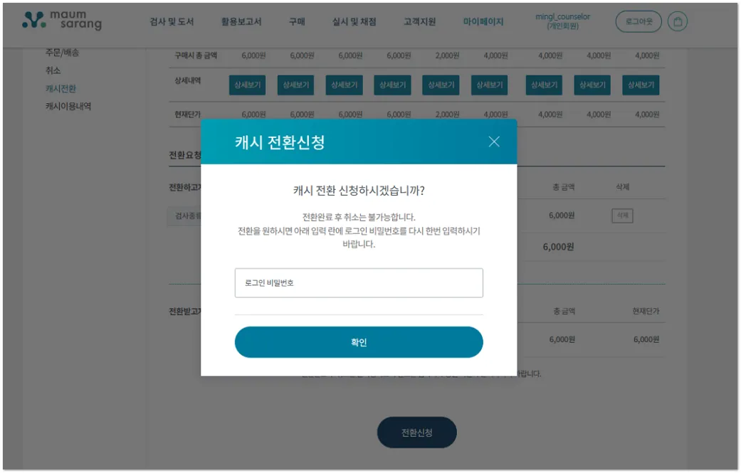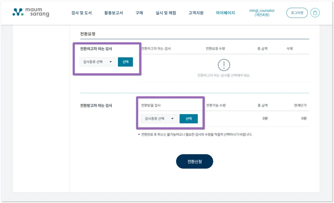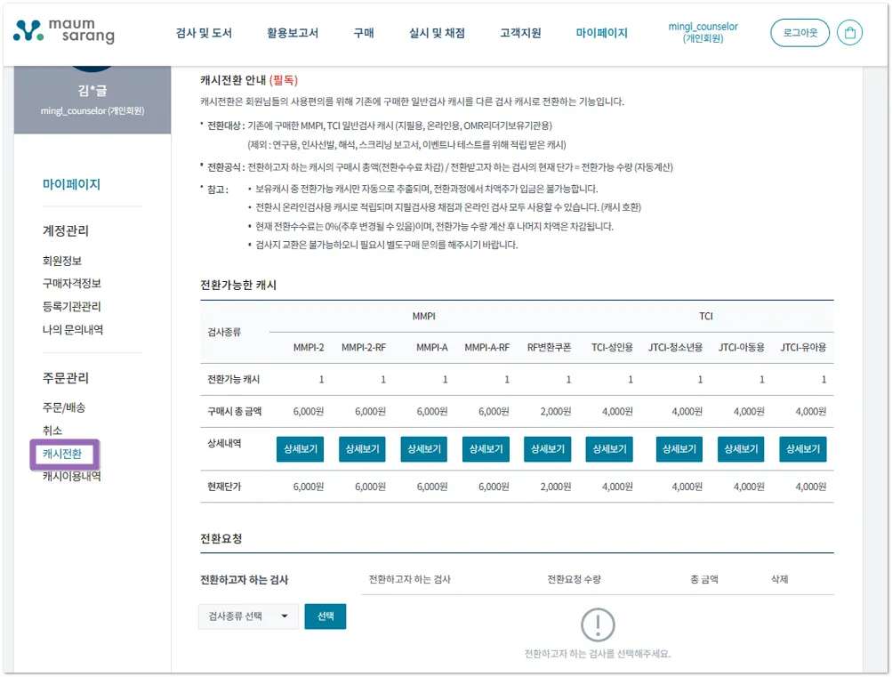 마음사랑 홈페이지>마이페이지>캐시전환>[전환하고자 하는 검사]와 [전환받고자 하는 검사]를 선택한 후 [전환신청] 버튼을 클릭해 주세요.