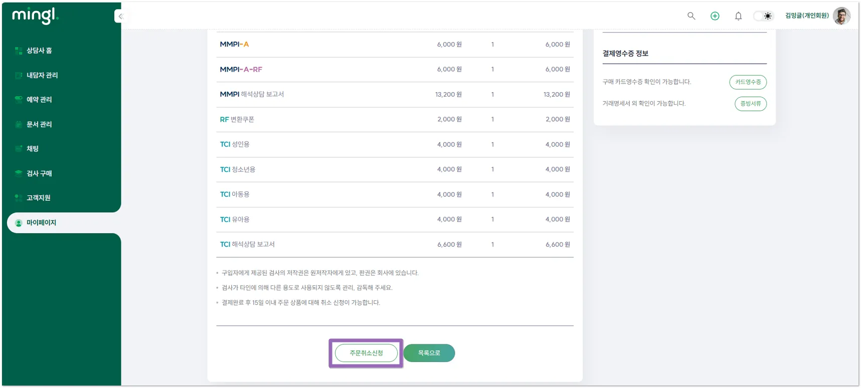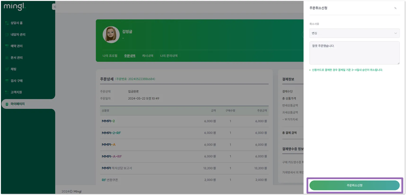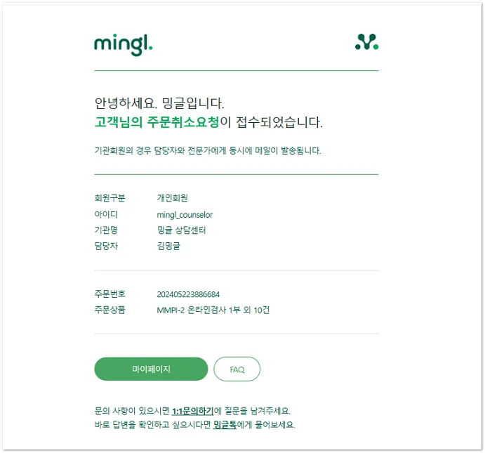 '[밍글] 고객님의 주문 취소 요청이 접수되었습니다'라는 제목의 이메일이 고객님께 발송됩니다.