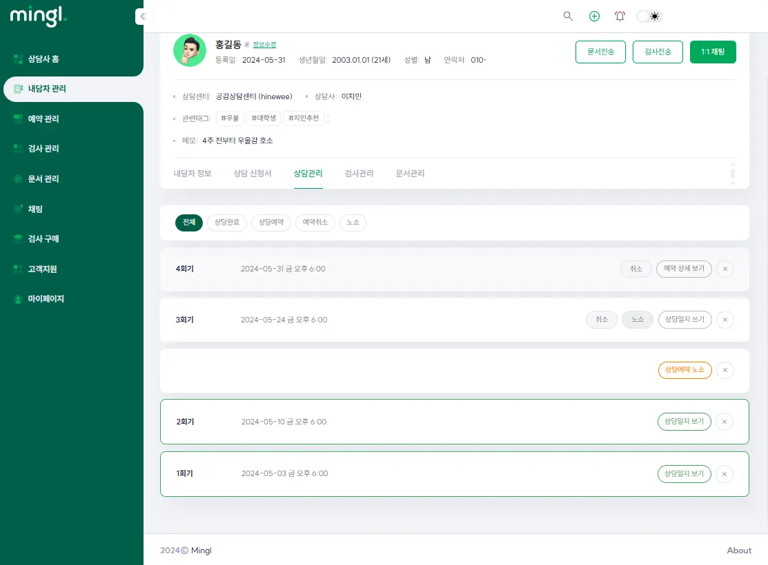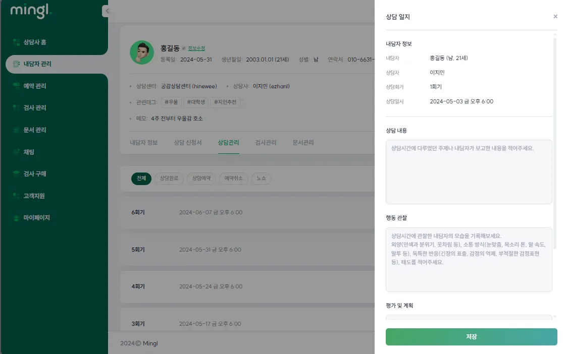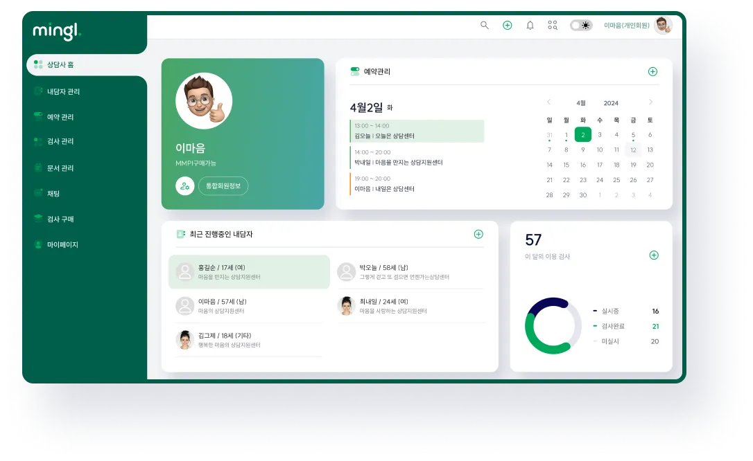 밍글은 상담 일정과 상담일지를 한번에 정리할 수 있는 상담 사례 관리 시스템을 제공합니다.