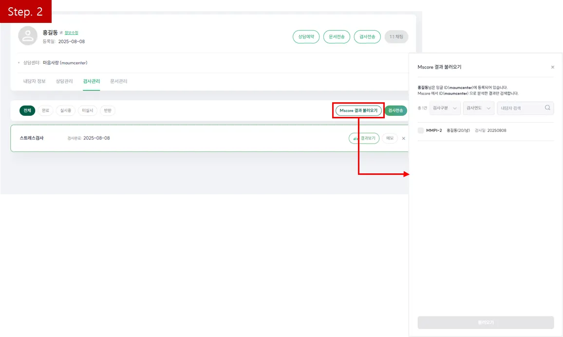 내담자 검사관리 페이지에 [Mscore 결과 불러오기] 버튼이 신설되었어요!