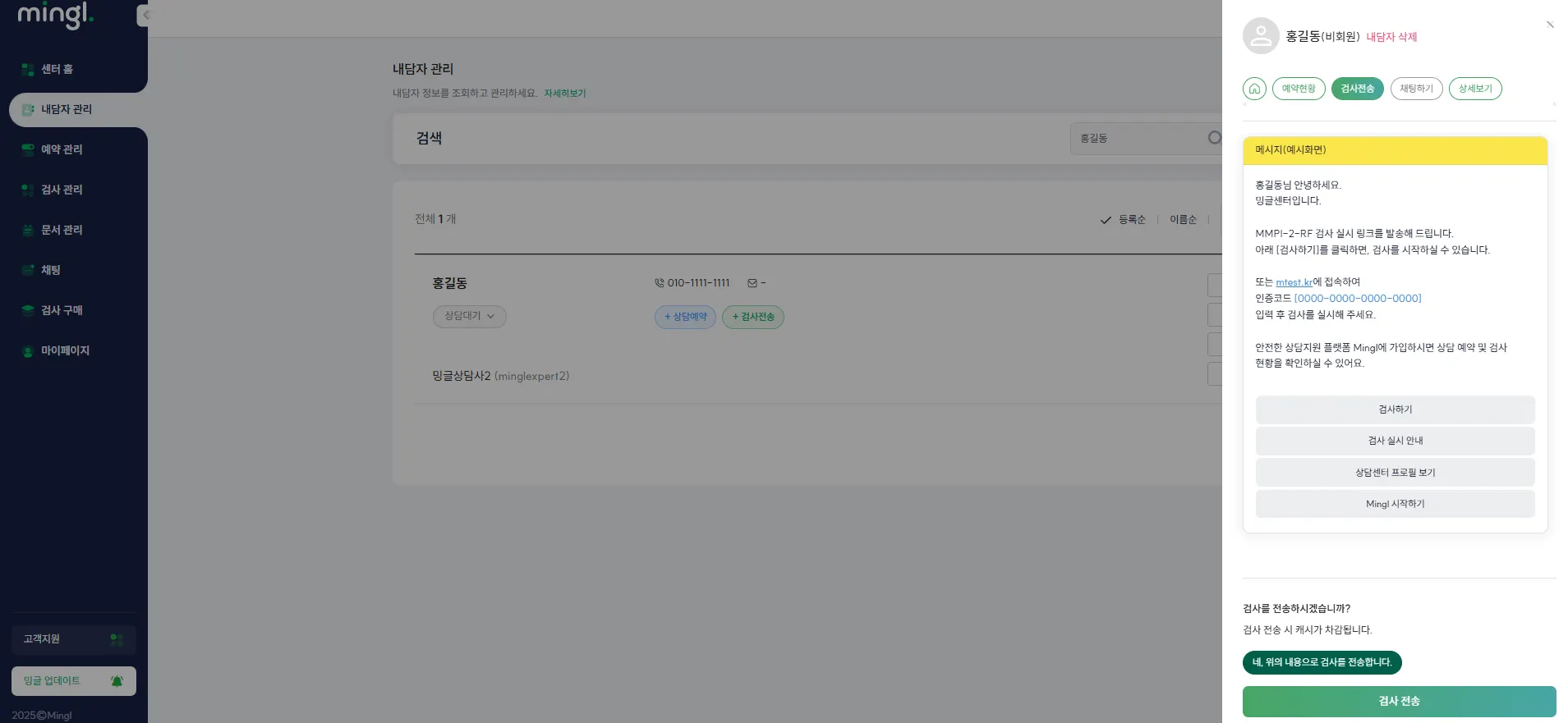 밍글에서는 검사 및 해석보고서 결과를 내담자에게 전송할 수 있어요.