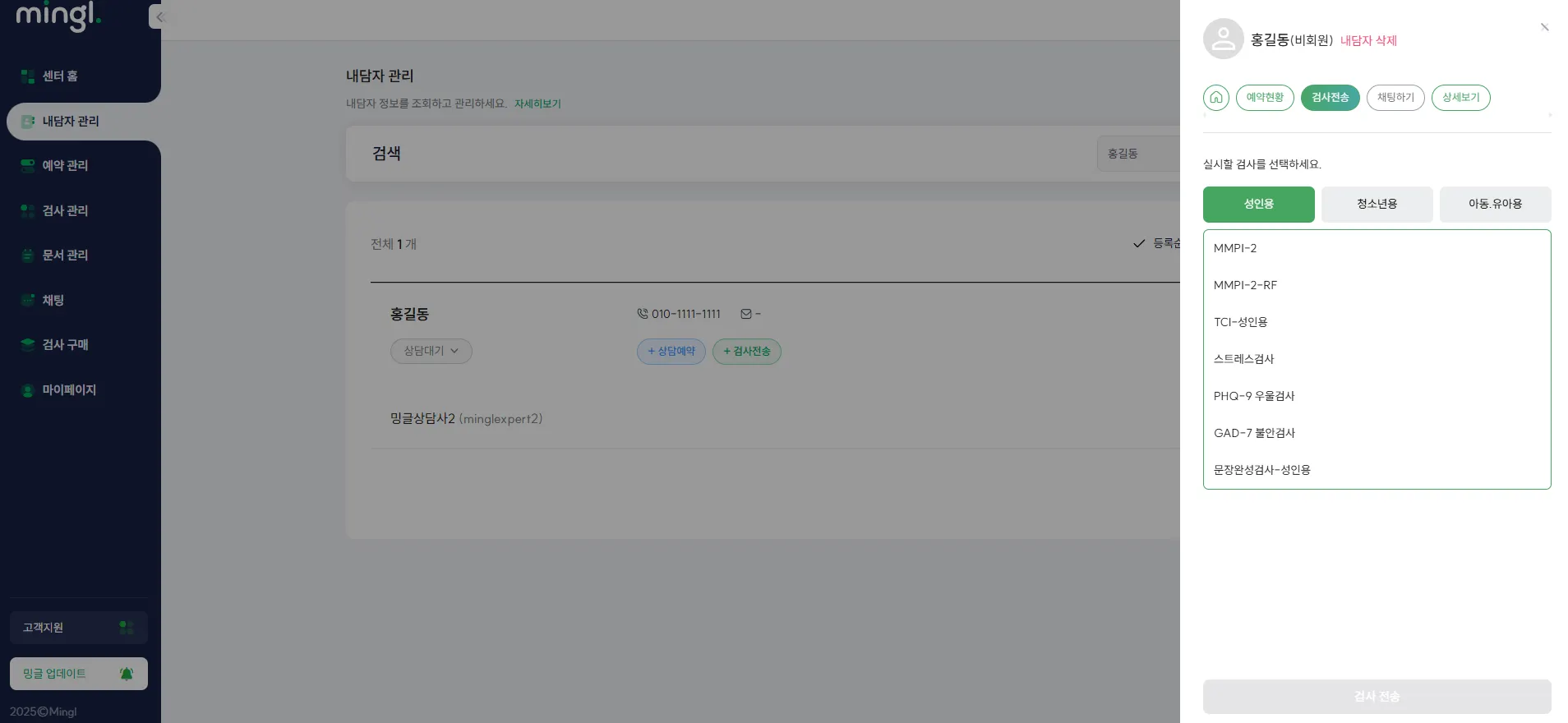 [검사 관리] 메뉴에서 밍글에서 실시할 수 있는 온라인 검사 종류를 확인하세요.