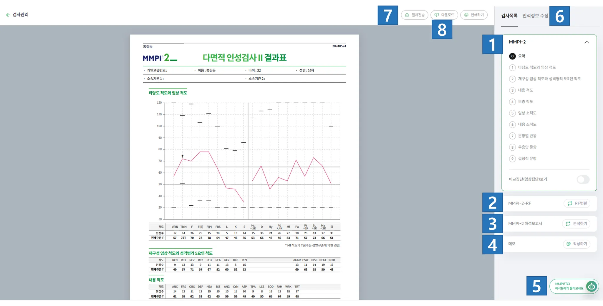 내담자 이름으로 Mscore 에 저장되어 있는 검사 결과가 자동으로 검색되어 제시됩니다.