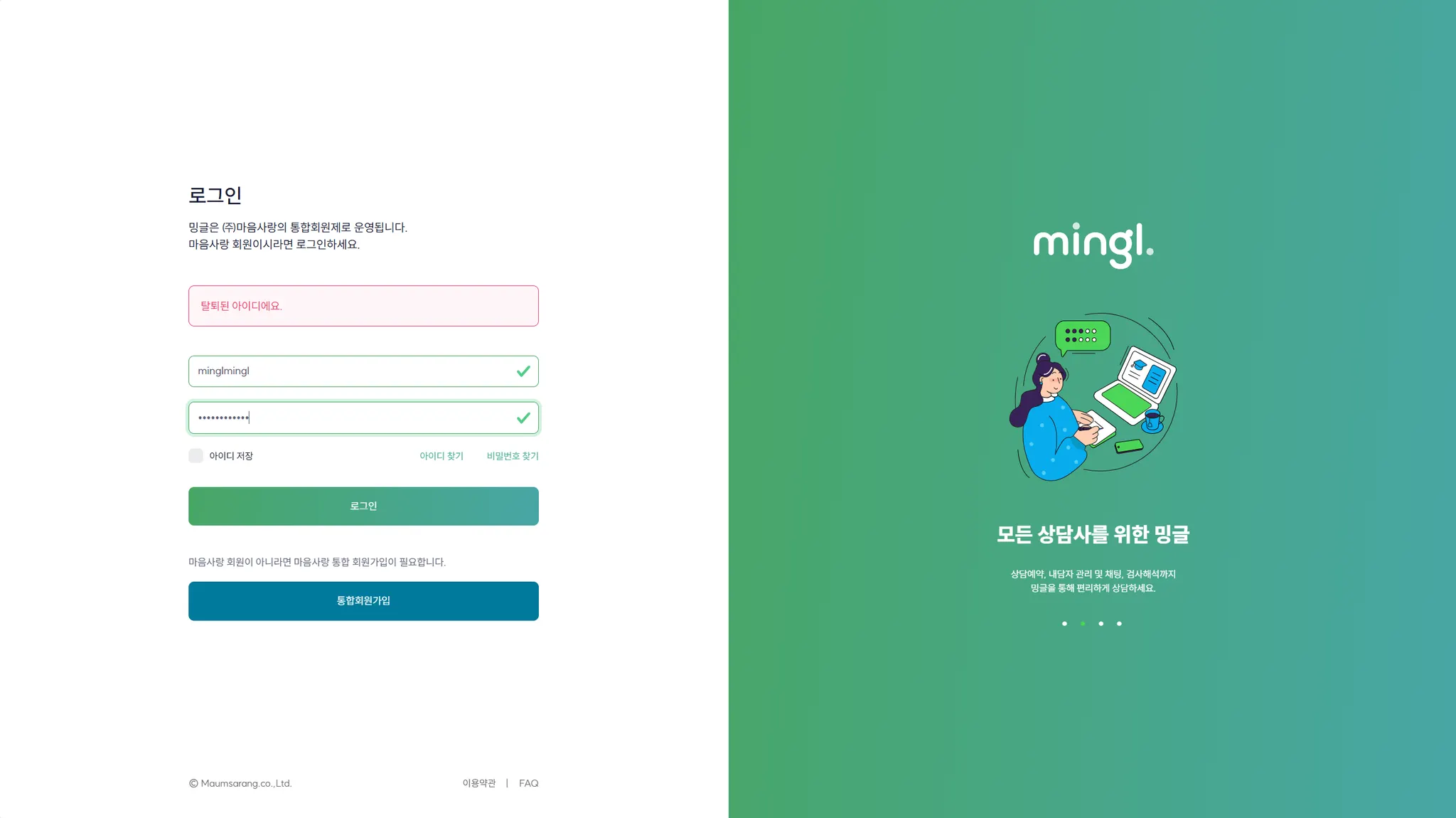 9) 밍글 사이트에 접속하면 “탈퇴된 아이디에요.”라는 안내가 나오고, 로그인이 불가합니다.