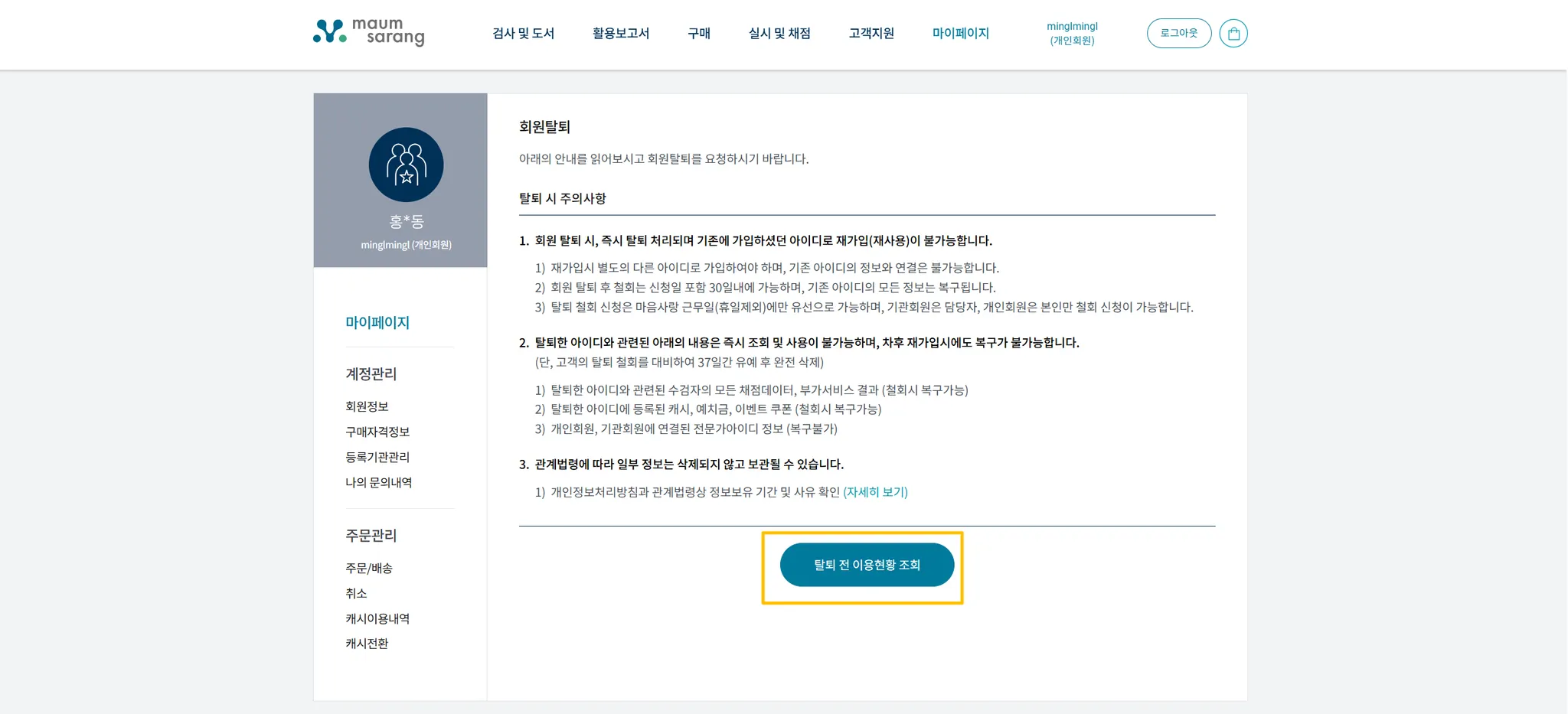 5) 탈퇴 시 주의사항을 확인한 후 [탈퇴 전 이용현황 조회]를 클릭해 주세요.