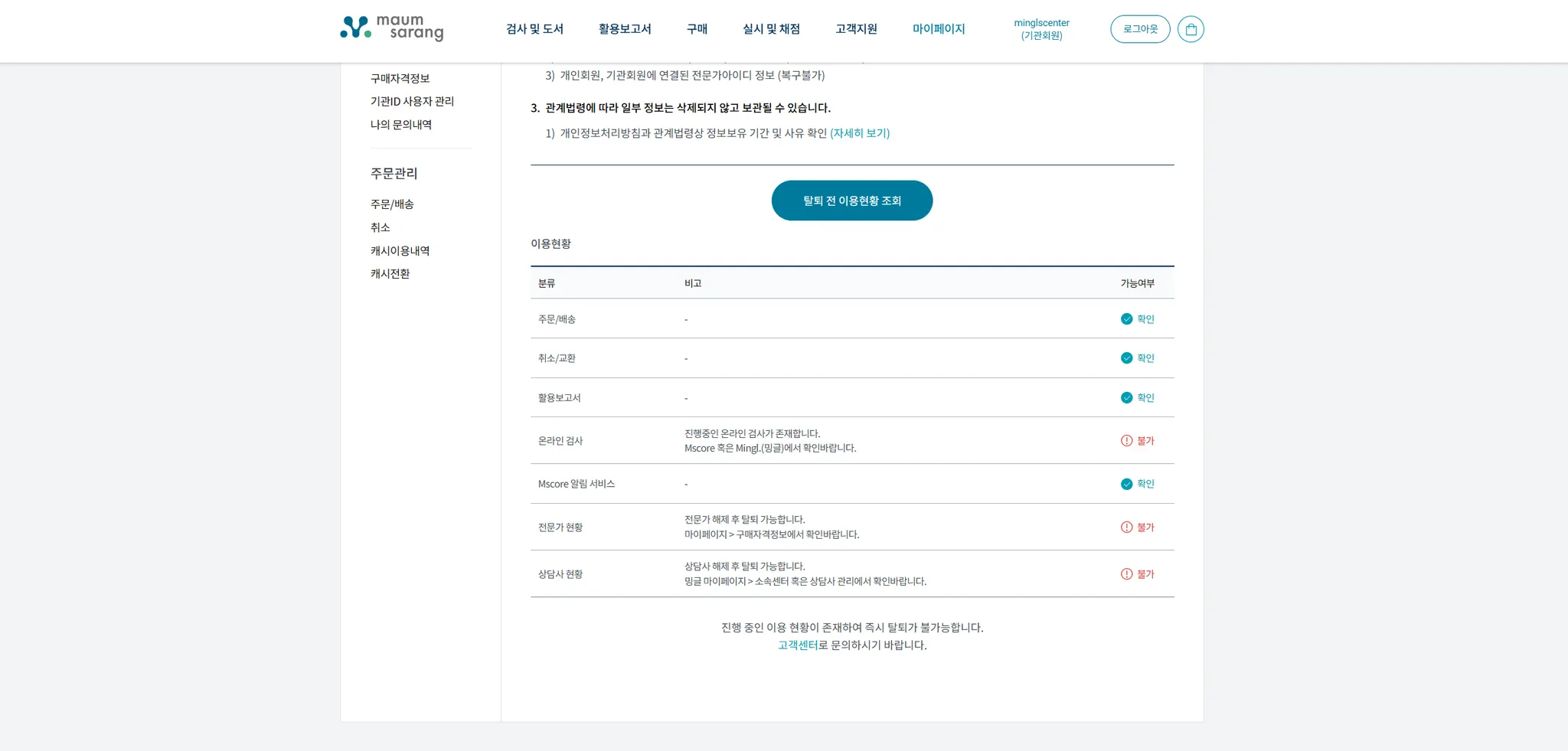 6) 이용현황에서 탈퇴 가능 여부가 “불가”로 표시된 항목이 있을 경우 확인해 주세요.