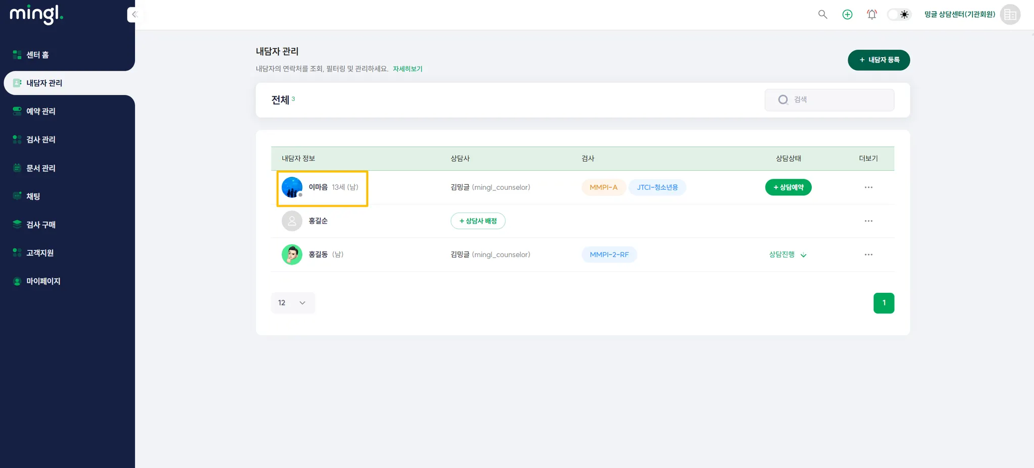 2) 사이드바에서 내담자가 밍글 회원인지 여부를 확인합니다. (이름 옆에 “회원”으로 표시됩니다)