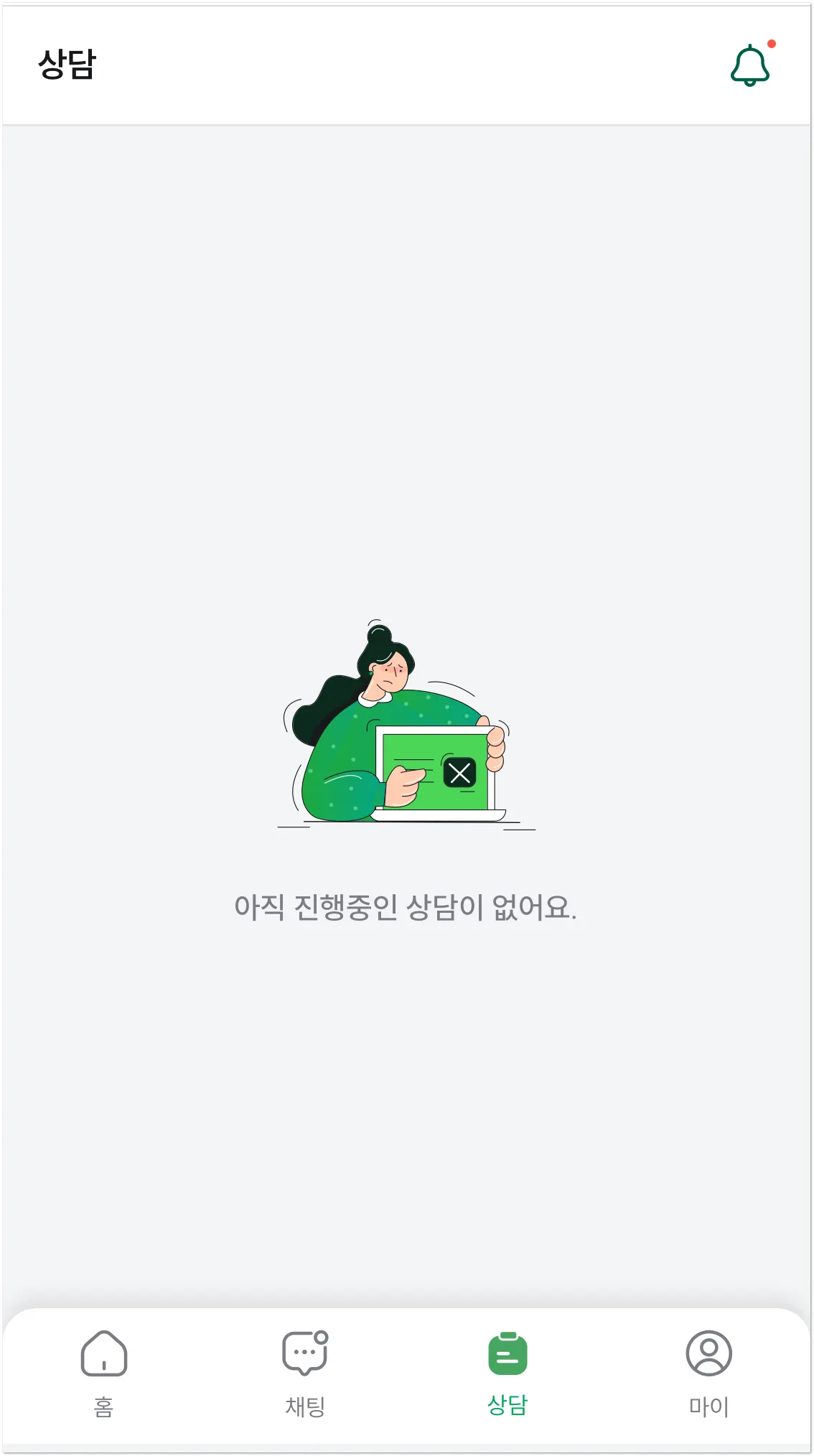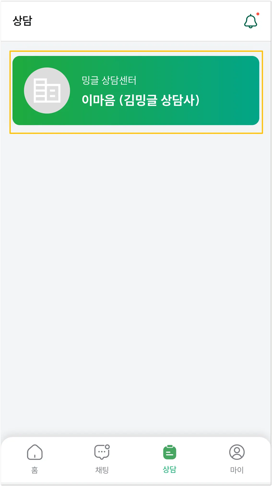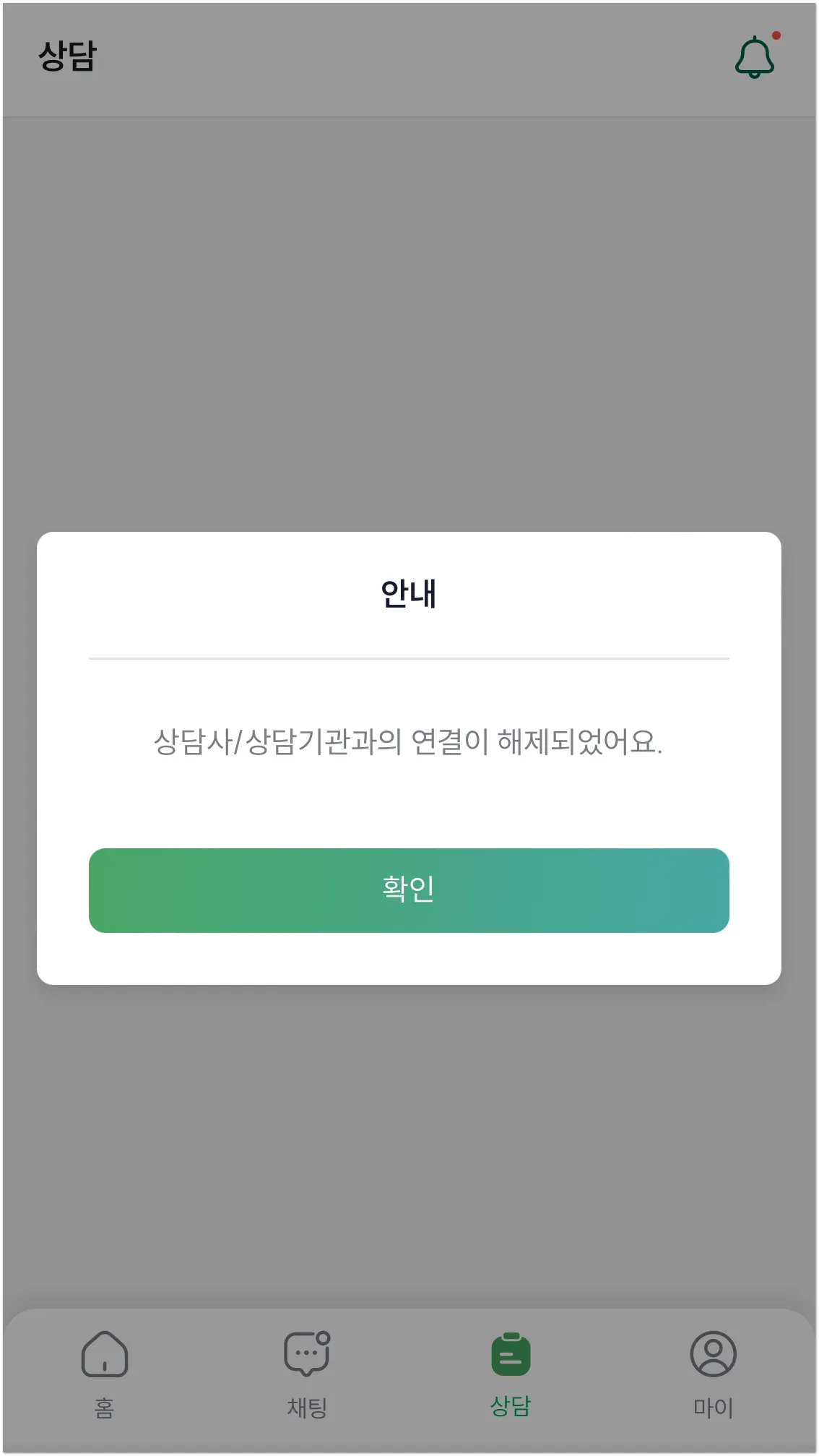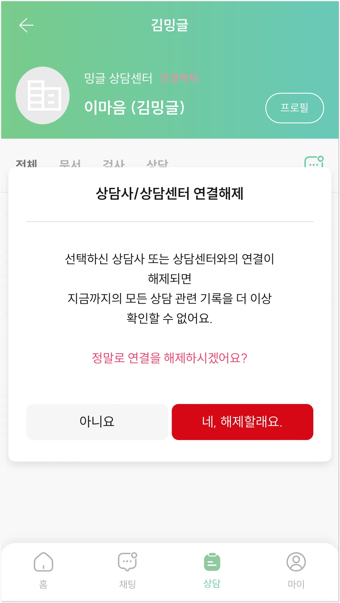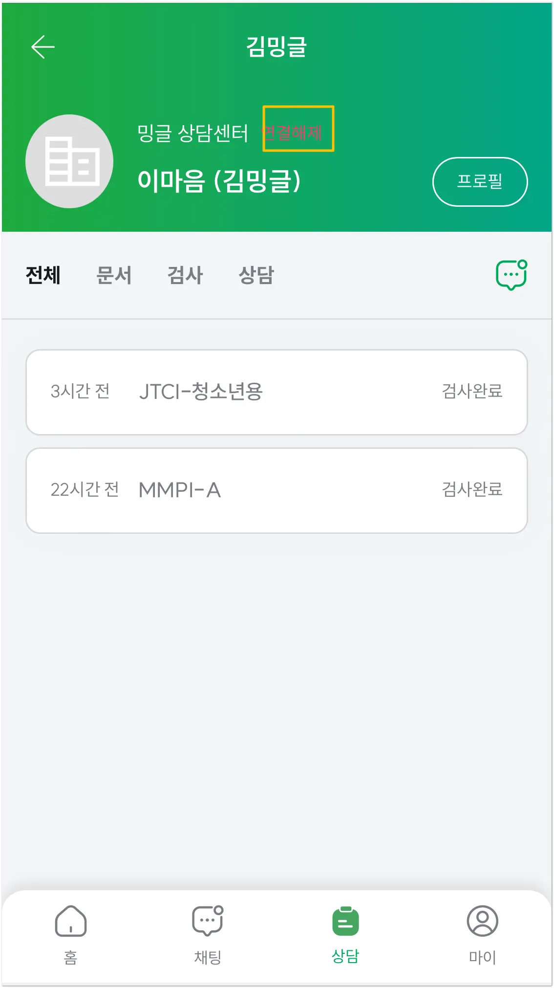 내담자가 밍글앱 로그인 >하단 메뉴 중 [상담] 클릭> 상담센터 선택 > [연결해제] 버튼을 클릭하면 상담사 및 상담 센터와의 연결이 해제됩니다.