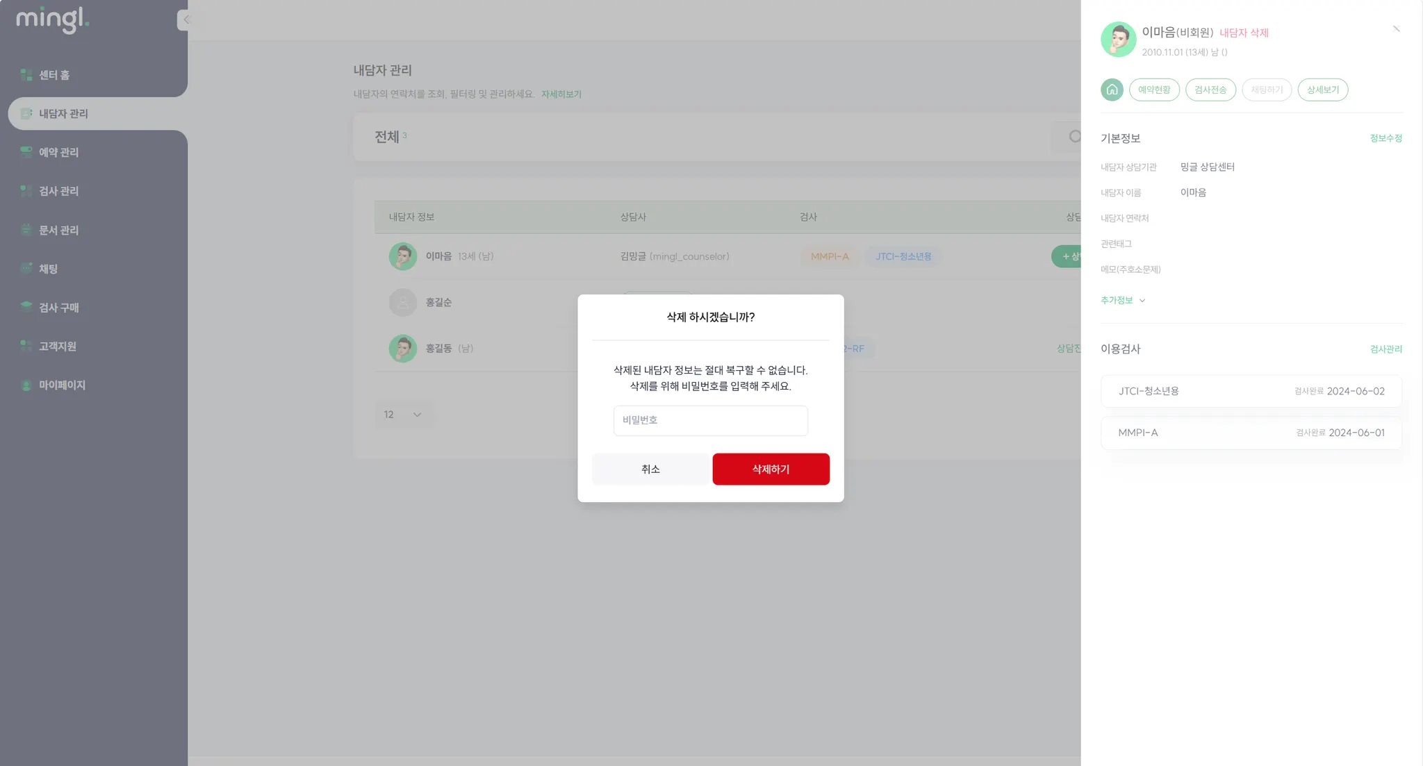 내담자를 목록에서 삭제한 후에는 데이터 복구가 불가하오니 신중하게 결정해 주세요