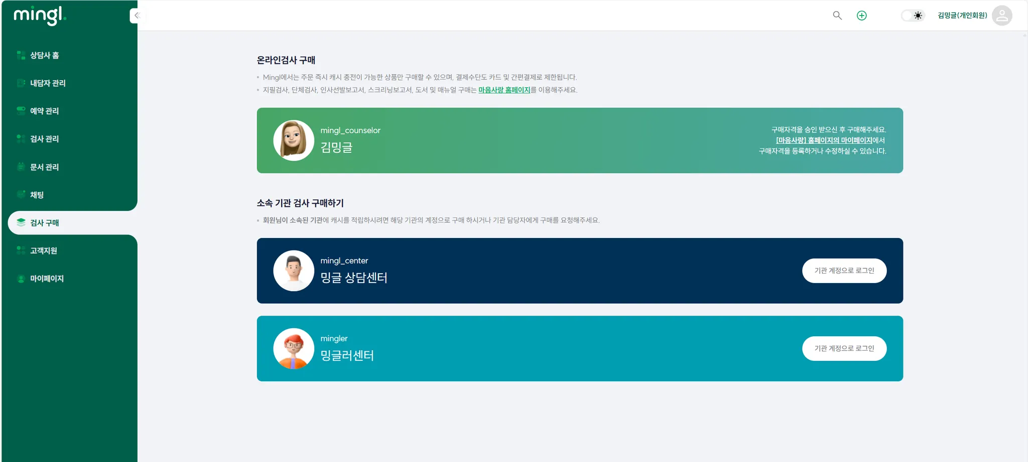 밍글을 이용하시려면 개인 ID가 꼭 필요해요. 단, 기관 비용으로 검사 구매를 하시는 경우에는 기관 ID에 상담사로 등록되어 있어야 합니다.