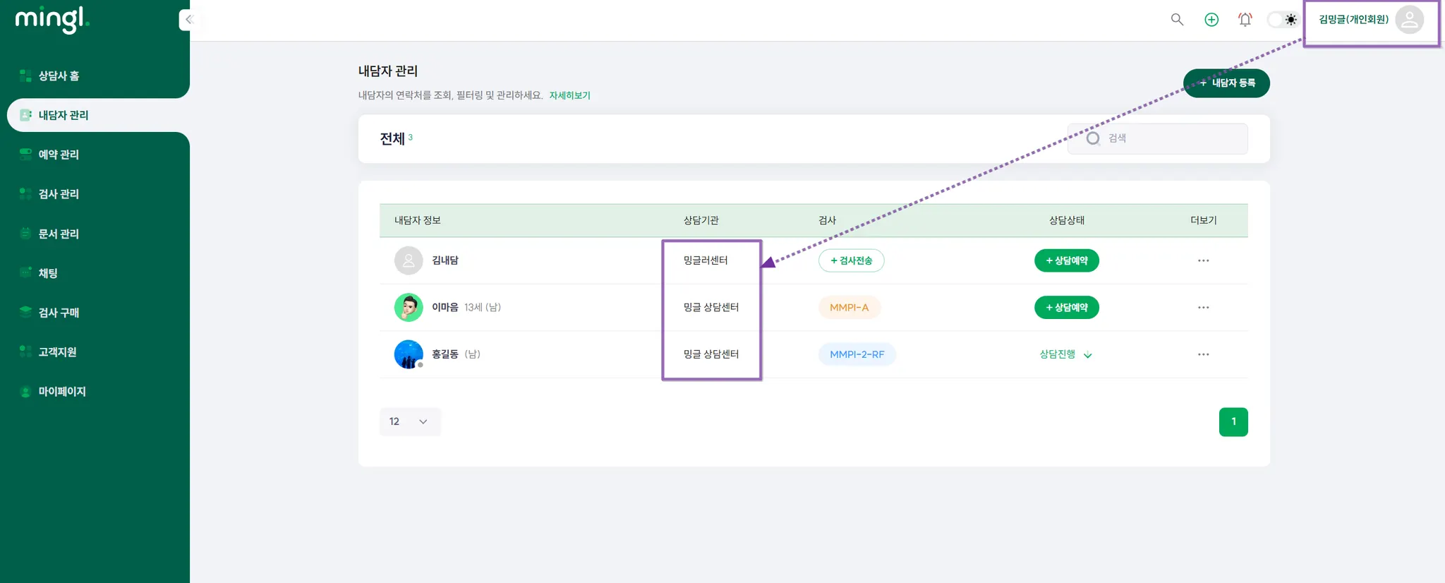 3) 여러 기관에 속해 있다면 여러 기관의 내담자를 나의 개인 ID로 모두 관리할 수 있어요.